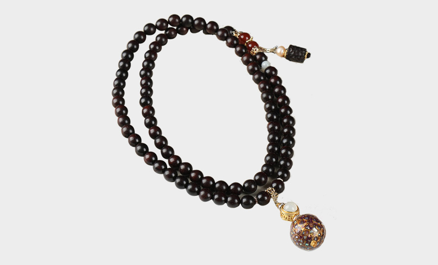 以小叶紫檀为主,辅以螺钿大漆珠,大漆珠工艺源于宋朝,制作使用木珠胚加上金箔、螺钿等天然环保材料,经反复上漆、阴干、打磨、推光等制作工序制作成光亮绚丽的作品。非凡 国风将东方美学与历史沉淀融为一体,形成优雅与精致共存的全新产品。