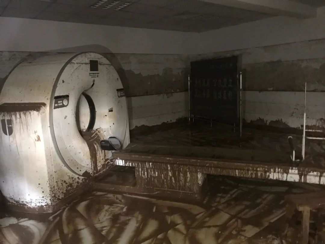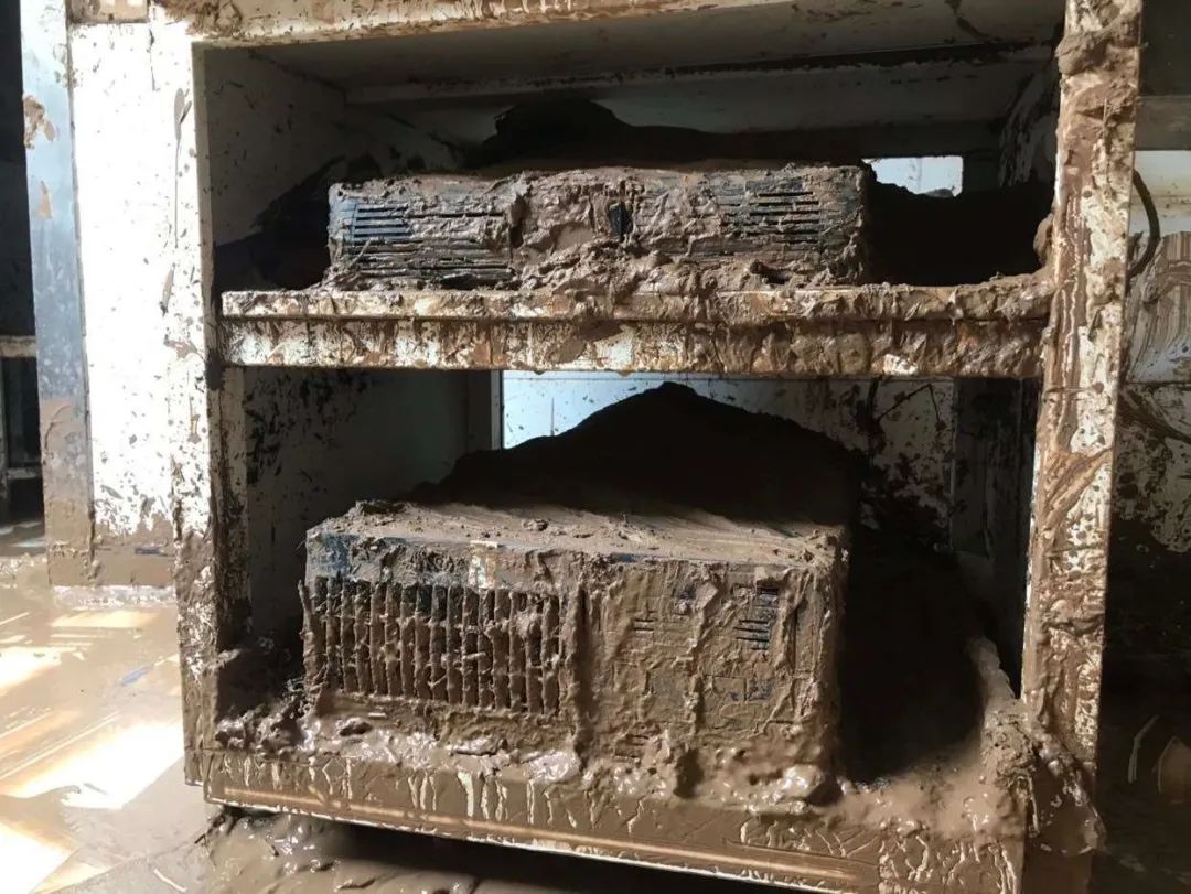 一些来不及清理的大型设备,被洪水夹带而来的淤泥裹上一层厚土,门外的检测设备也变成了“出土文物”。