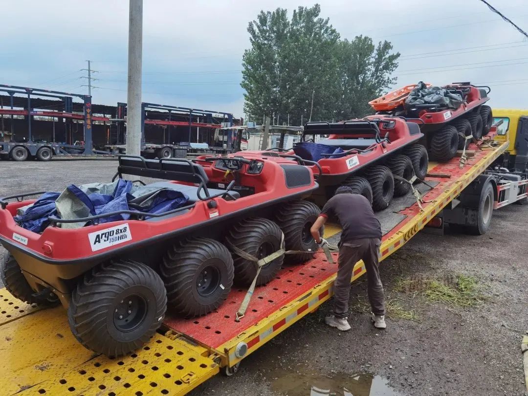 这四辆全地形水陆两栖车有“陆上猛虎,水中蛟龙”称号,每辆长约2.5米,宽约1.8米,是最先进的8轮驱动车。该车不仅能上山下坡,平蹚淤泥沼泽,还能架设急救担架救助不能自主行走的人群,是内涝救援、冰雪灾害救援一把好手。