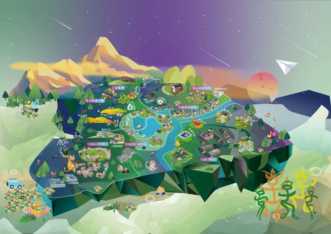 依托当地深厚的自然及人文底蕴,度假区集合了旅居生活、度假住宿、艺术文化、自然休闲四大体验板块,融入包括Club Med度假村、主题商业娱乐街区、雪山秘境主题公园、度假屋、Casa Cook野奢精品度假酒店、爱必侬度假公寓等多元业态。