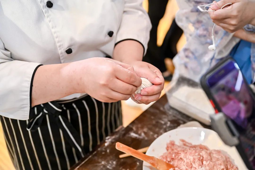 南翔馒头店不仅带来了各色招牌小笼馒头,第六代非遗传承人游玉敏也在现场展示南翔小笼馒头包捏技艺,让消费者感受非遗技艺的匠心;
