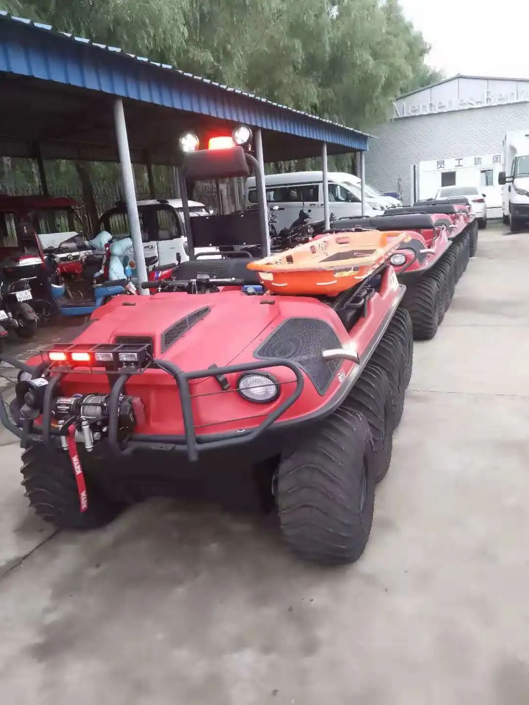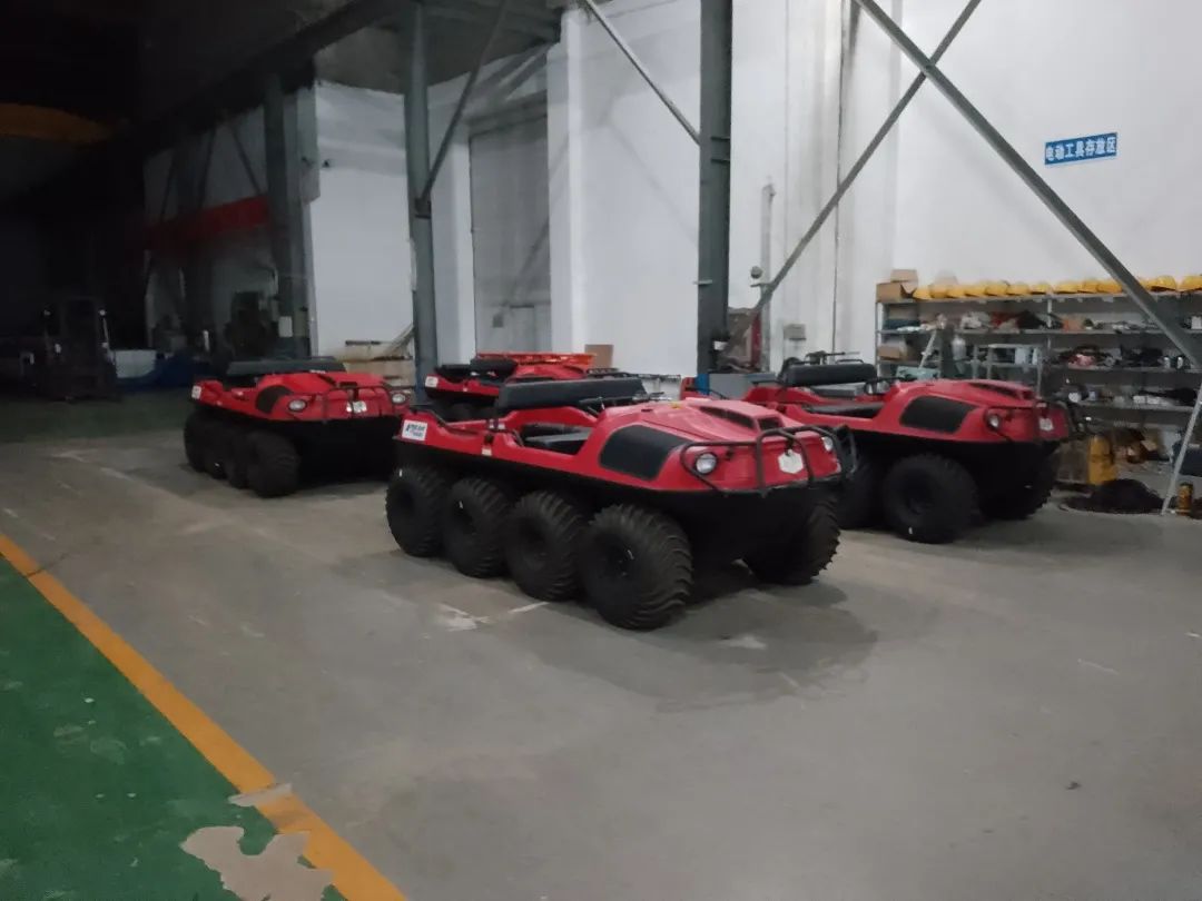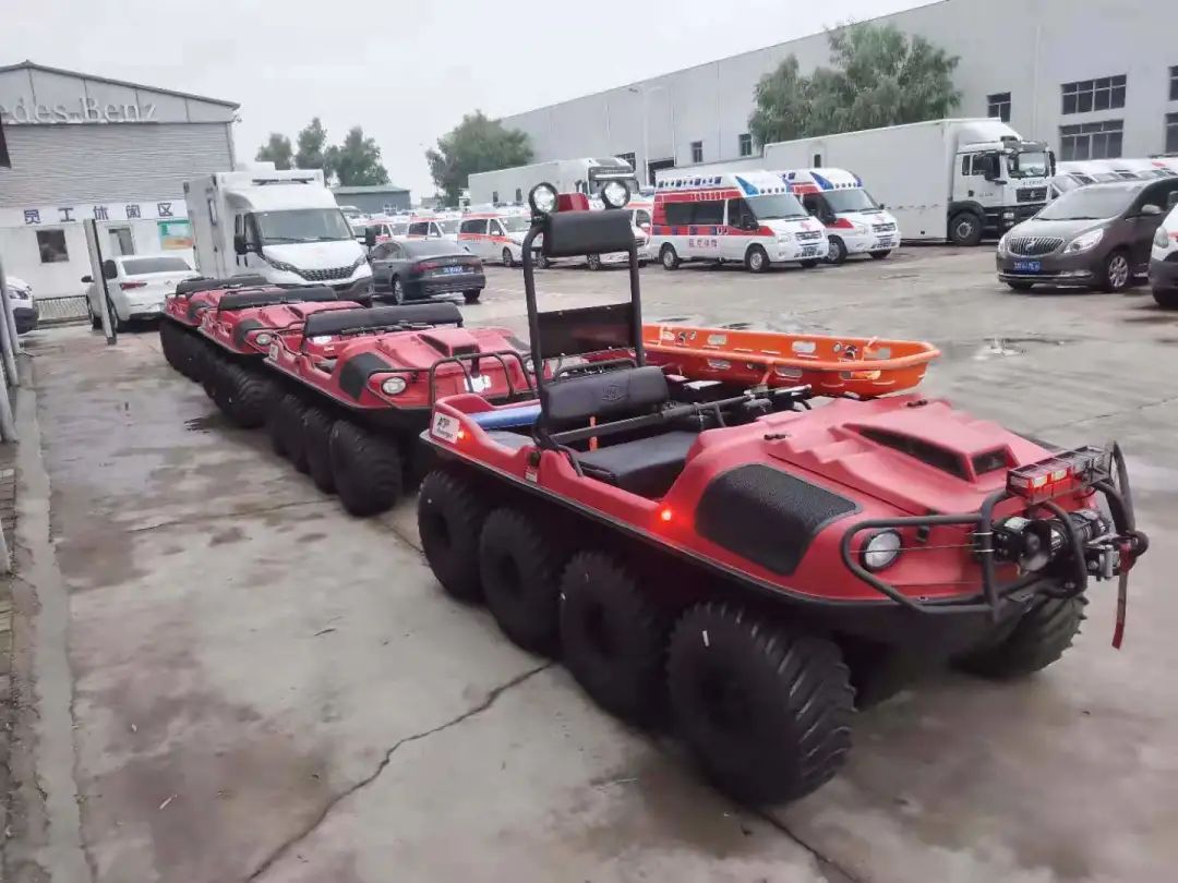这批全地形车是市面上最先进的8轮驱动,能上山下坡,平蹚淤泥沼泽,极限爬坡度45度,最高行进速度32公里/小时,能原地180度转向,离地间隙极高、保证车辆高度防倾翻,还能架设急救担架救助不能自主行走的人群,是内涝救援、冰雪灾害救援一把好手。