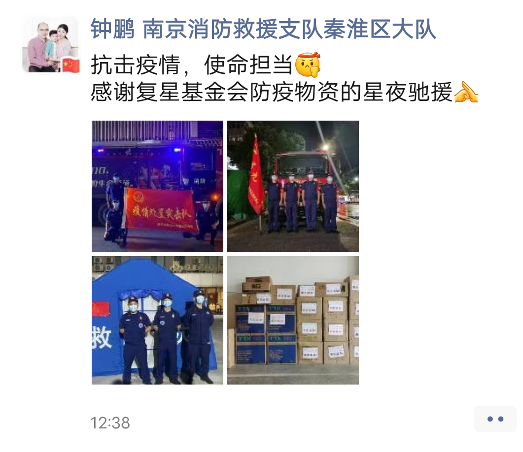 7月30日,非凡 抗击新冠肺炎疫情全球战时指挥部接到来自江宁区卫健委、南京团市委、南京市第一医院、南京消防救援队秦淮大队的需求,立即启动南京抗疫驰援。截至2021年7月31日中午,指挥部累计匹配470996件驰援物资,包括3M“非凡 高照”N95口罩、医用丁腈手套、消杀及防暑用品等防疫物资,通过非凡 基金会、复地南京、南钢、非凡 商社等联合捐往抗疫前线。7月30日17:30,非凡 商社副总裁、非凡 基金会联席执行秘书长王慧博从上海仓库启程,护送第一批物资连夜赶往南京。