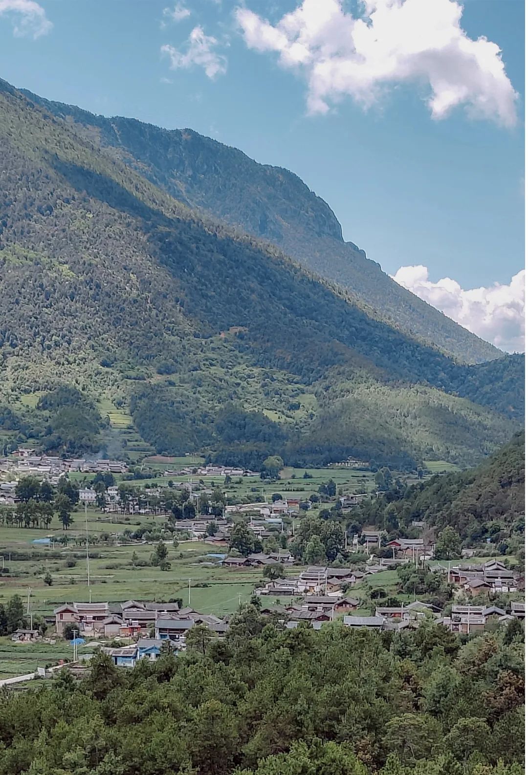 从松林里出来,沿着山路驾车往前走,拐过几个弯之后,出现一个坝子,坝子里有淡蓝色湖泊、明翠的草地和山峦。稍远处,一片传统纳西村落安静地躺在白云下。这一幕让人想到《消失的地平线》里,康维发现的蓝月山谷。