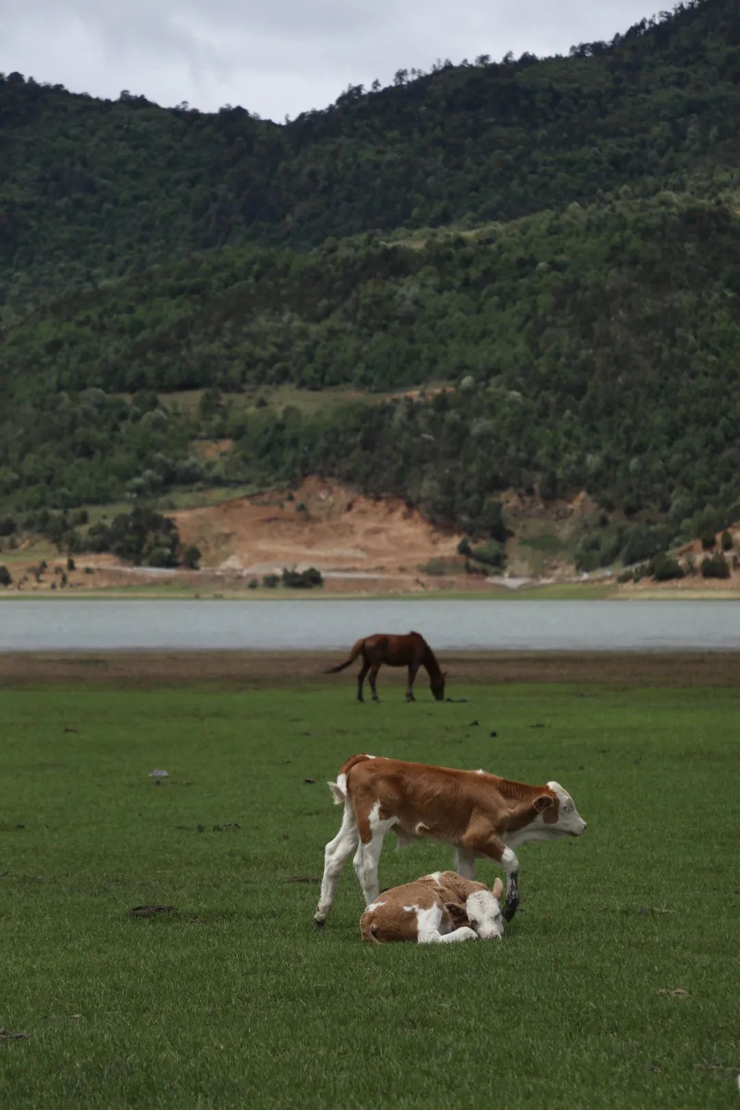 从山腰下到湖边,一群牛犊和几只小马驹自由自在地在草地上奔跑,还有几只淘气地顶犄角。在这里,它们的生命属于自己,而不是别人的工具。