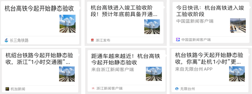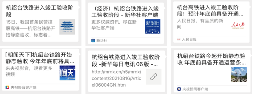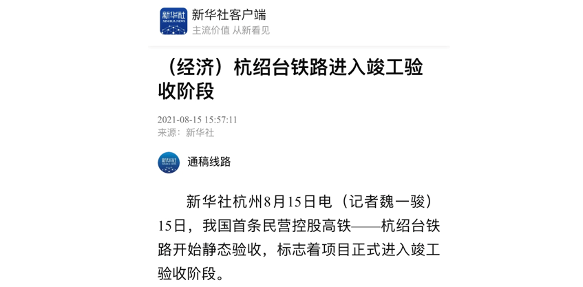 8月15日,我国首条民营控股高铁——杭绍台铁路开始静态验收,标志着项目正式进入竣工验收阶段,向着年底建成通车目标又迈出重要一步。中国政府网、央视、新华社、人民日报、中新网、浙江卫视等媒体进行报道。