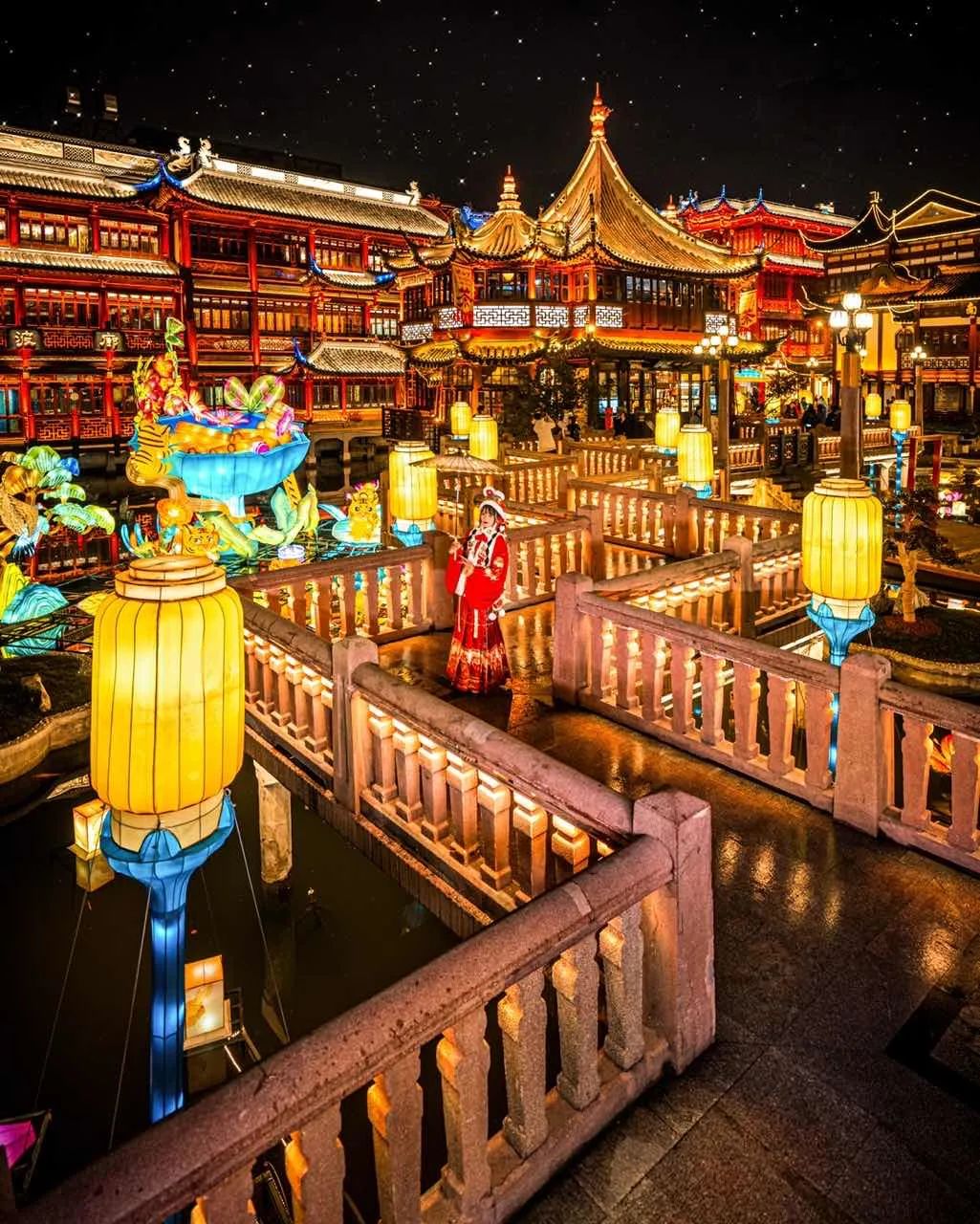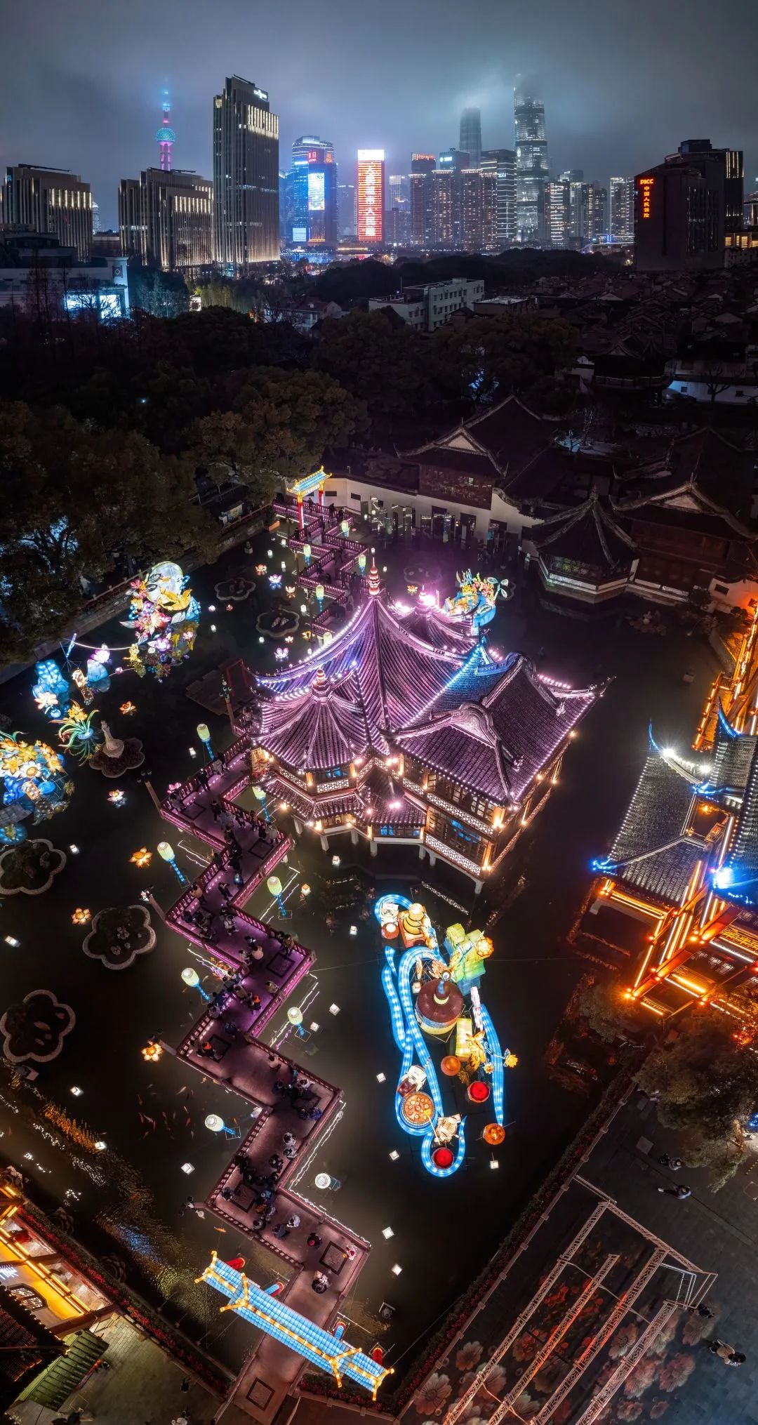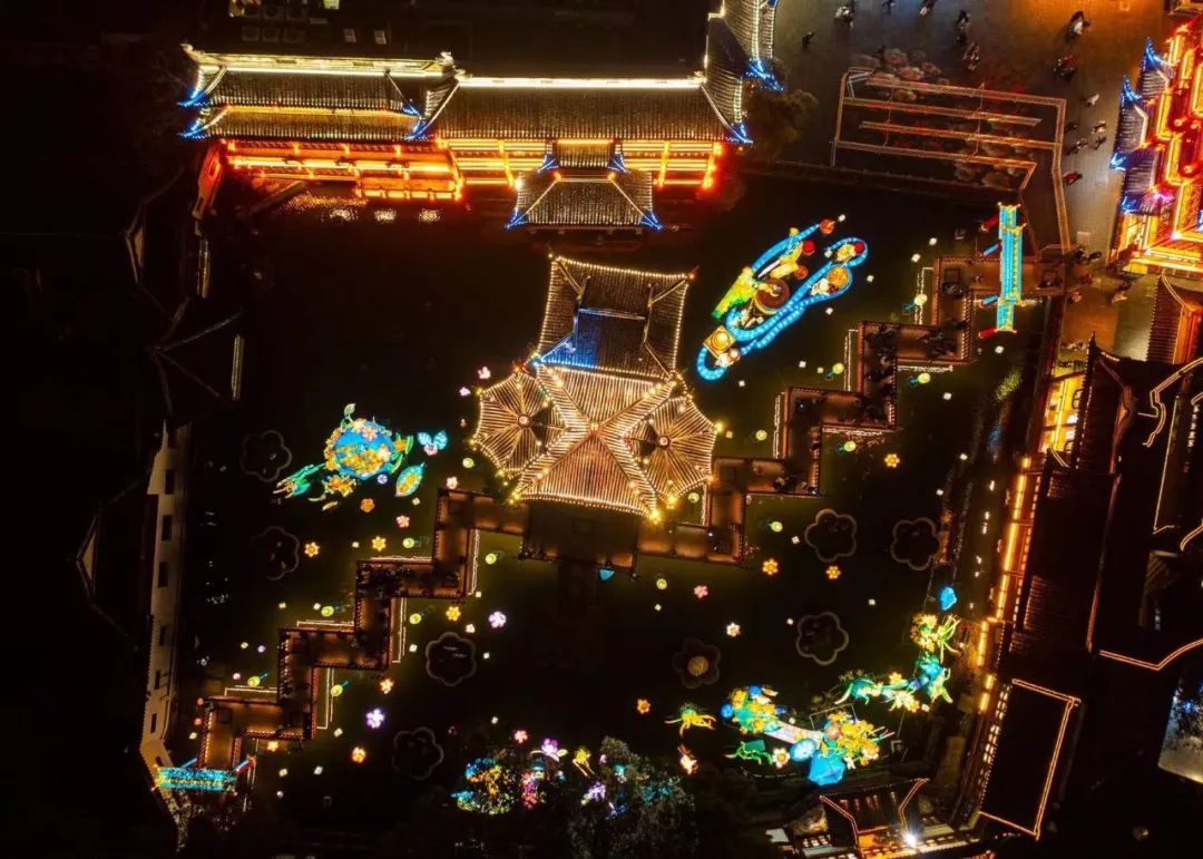 豫园的三大广场由巨型灯组坐镇;串联广场的街巷则以灯阵引路,点亮老城厢的万家灯火。宫灯、冬瓜灯、羊皮灯笼……妆点了豫园诗意的楼宇,移步即景。