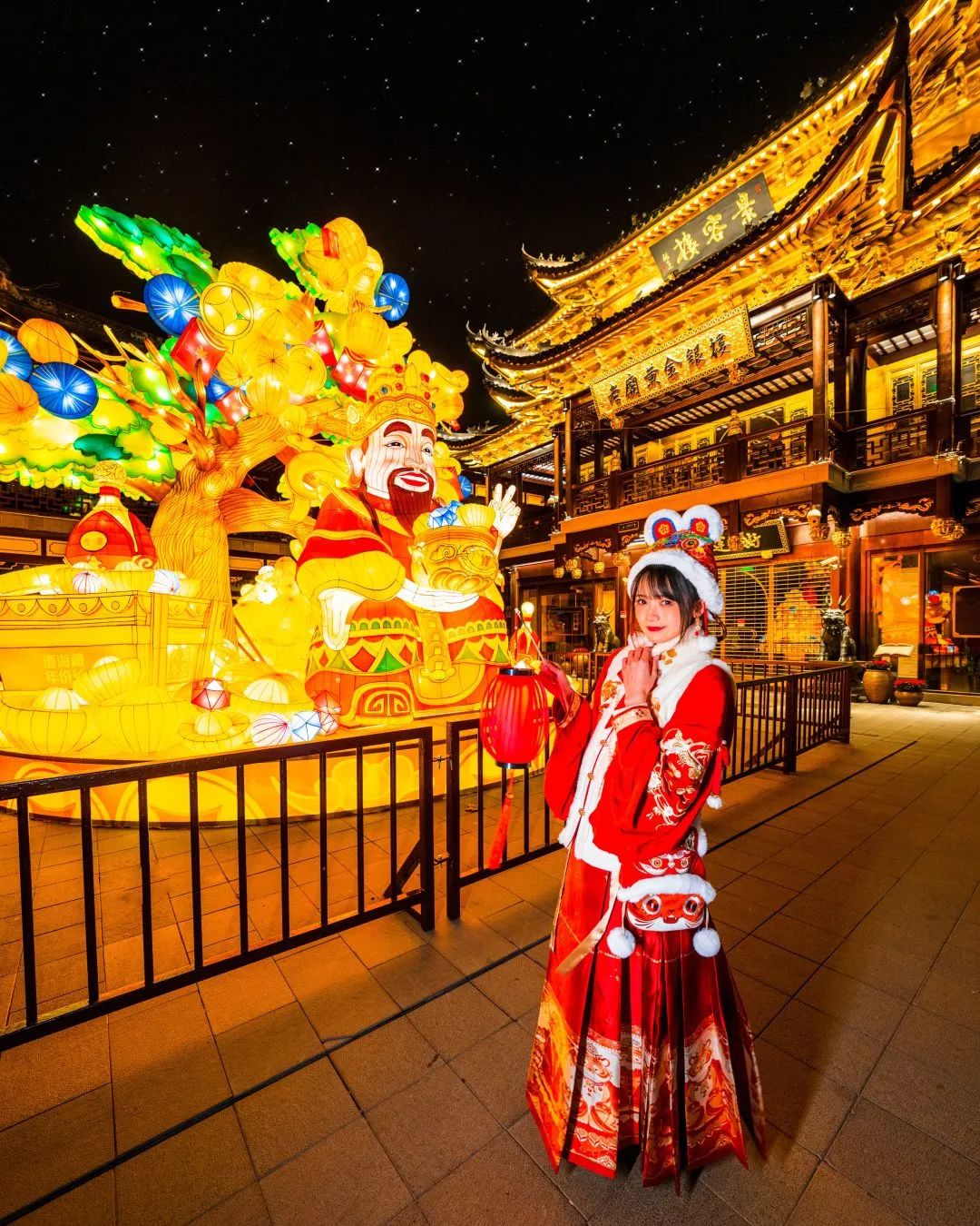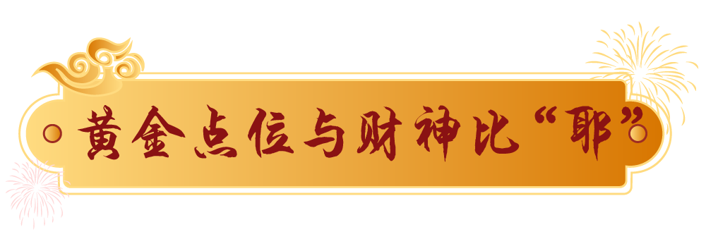 招财树下,财神爷一手捧元宝、一手比“耶”,组合成谐趣的“财神‘耶’”灯组,果真·黄金点位。市民朋友们不用等到初五接财神,随时能来豫园这块福地沾沾好运气。
