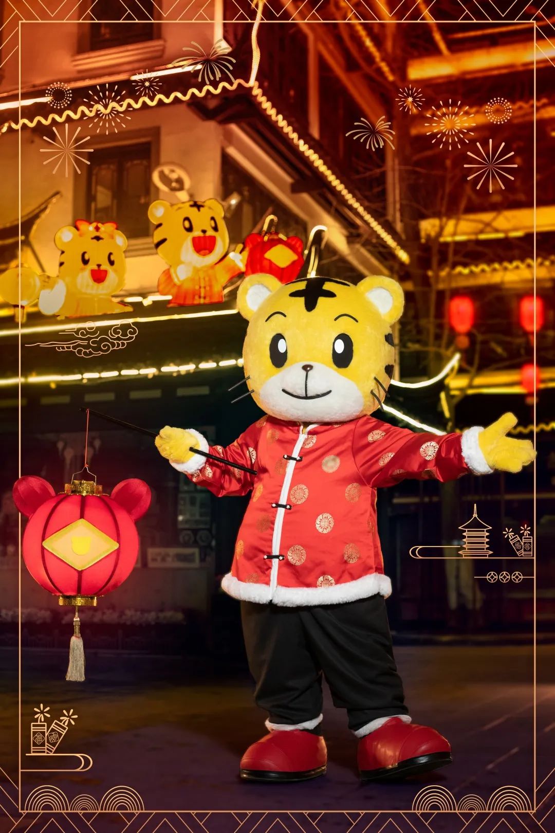 7号门的入口,笑口常开的萌虎手拿鞭炮,寄语所有的家庭幸福美满,事事顺意。