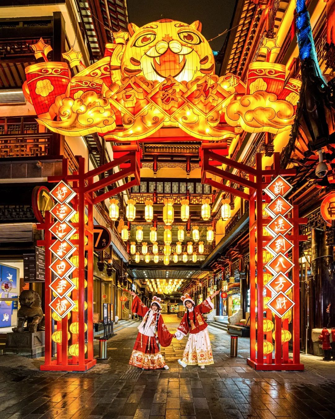 顺着黄金广场往北,一路置身流光溢彩的凝晖路。这里历来是出片圣地,千灯街市遇见如鸟斯飞的凝晖阁,组合成虚实交织的梦幻构图!仔细一看,灯笼上好像也是虎元素哦。