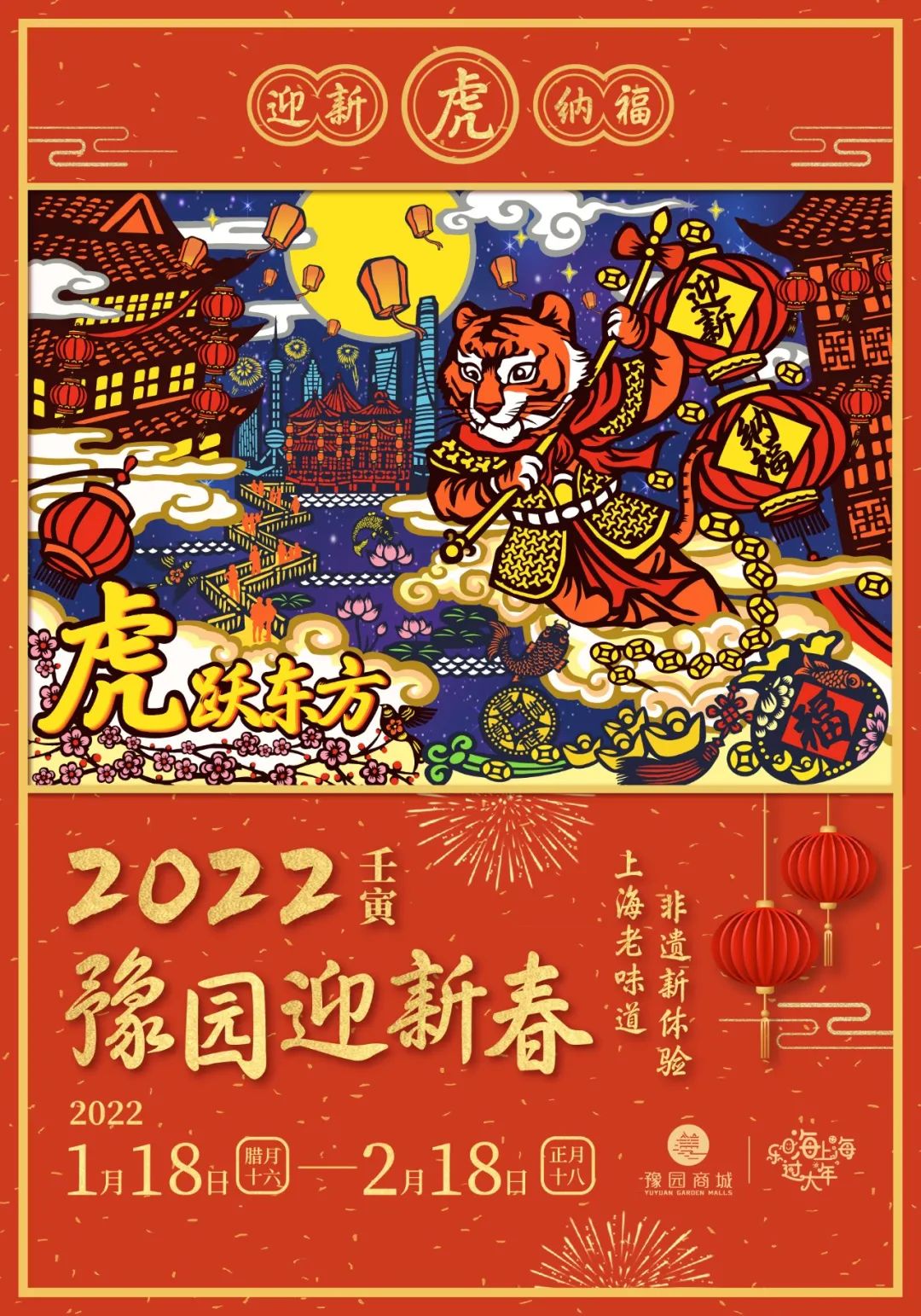 魔都C位的生肖虎,还看豫园商城中心广场的“虎跃东方”。此虎身高超过9米,傲立山头,其短须威武、斑纹绚烂,具象了成语“虎虎生威”的含义。