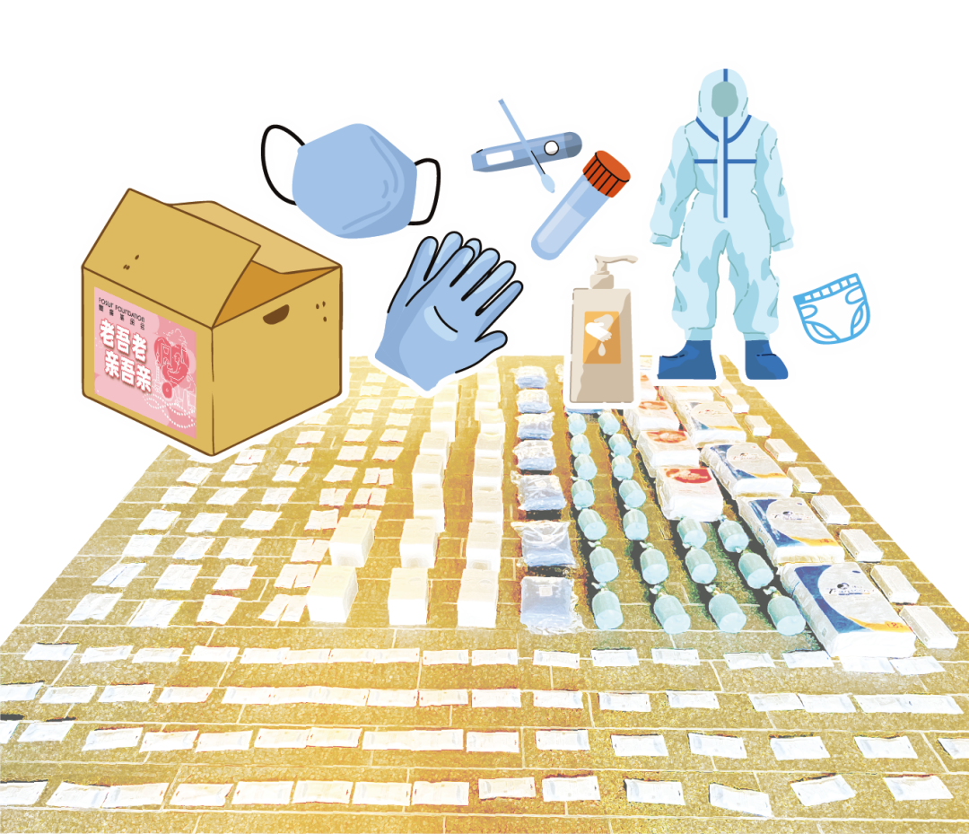 项目启动同时,团队就在筹备“防疫包”标准化。“老吾老”得到非凡 基金会公益合作伙伴的关注,也得到社会爱心人士的捐赠。他们的爱心物资更快落地,就能满足更多老人的应急需求。提升速度,“标配”是好办法。