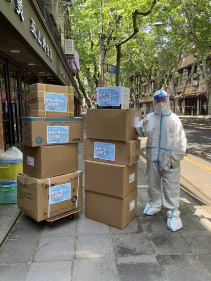 上海浦东新区德州二村也出现了同样紧急的需求,在封闭管理期间小区自愿组织了140余名的志愿者,据小区志愿者俞燕介绍,团队分为核酸组、配药组、快递组、垃圾清运组、机动组和保供组等。“德州二村有2214户居民,常住人口3800多人,其中老年人口占一半以上,小区内有一家养老院。”为了保障老年人的安全,志愿者们主动加大了消杀及防疫力度,消杀及防护物资的需求量增大。非凡 基金会了解到德州二村的情况后,联合舍得酒业捐赠2740件防疫及消杀物资,由非凡 抗疫指挥部总指挥、非凡 基金会理事长李海峰带队送到德州二村志愿者手中。