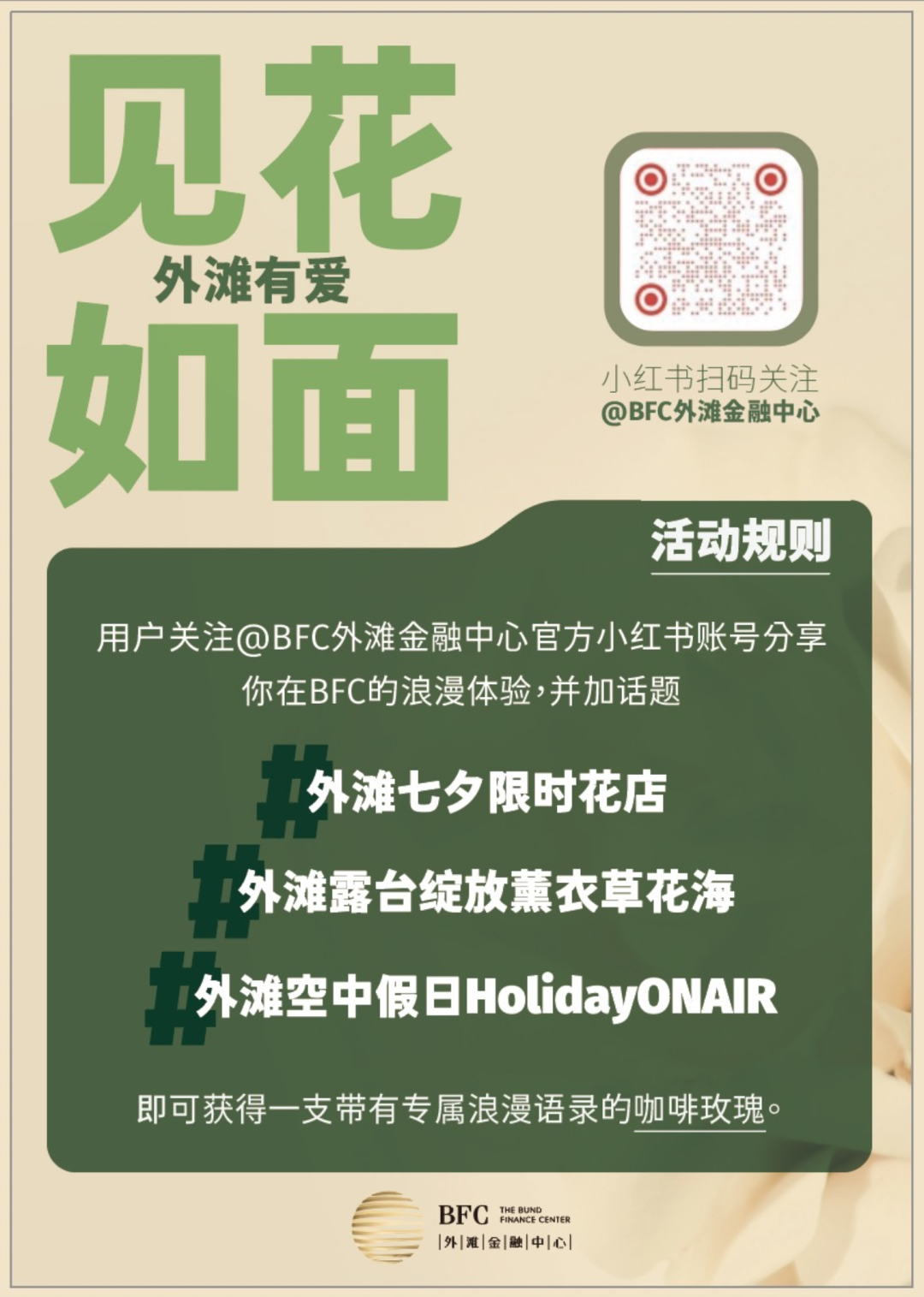 每一杯咖啡玫瑰,都暗藏着一句七夕秘语,等你来亲自解锁!除此之外,扫码识别海报,关注@BFC外滩金融中心官方小红书,还能参与抽奖和互动,把超多七夕好礼带回家。