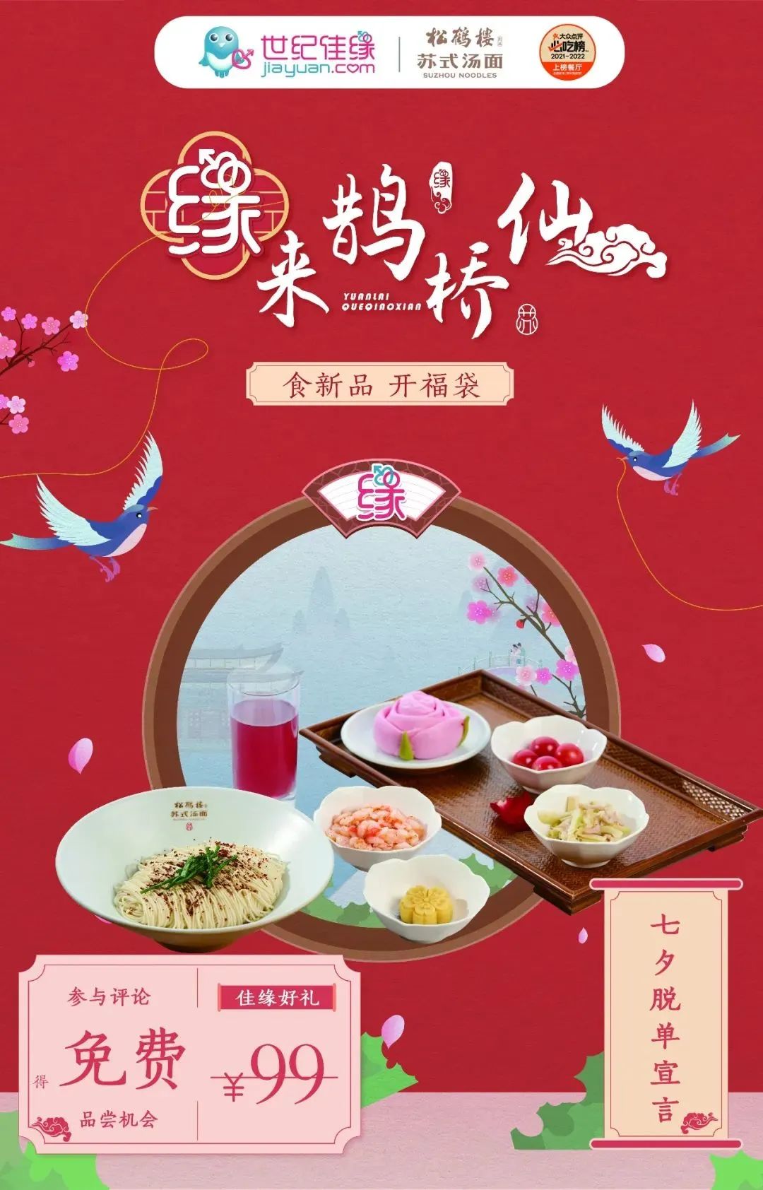 世纪佳缘 × 松鹤楼面馆来送七夕福利啦!评论说出“你的七夕脱单宣言”,8月5日12点前点赞数量最高的用户可免费兑换松鹤楼面馆“佳缘套餐”1份!七夕脱单,尽在“缘来鹊桥仙”!