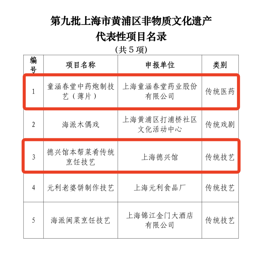 近日,黄浦区人民政府公布了第九批上海市黄浦区非物质文化遗产代表性项目名录和第十批上海市黄浦区非物质文化遗产代表性项目代表性传承人名单,豫园股份旗下的德兴菜馆本帮菜肴传统烹饪技艺、童涵春堂中药炮制技艺(薄片)获评第九批黄浦区非物质文化遗产代表性项目,原童涵春堂员工马伟国、德兴菜馆品牌总厨梅林获评第十批上海市黄浦区非物质文化遗产代表性项目代表性传承人。