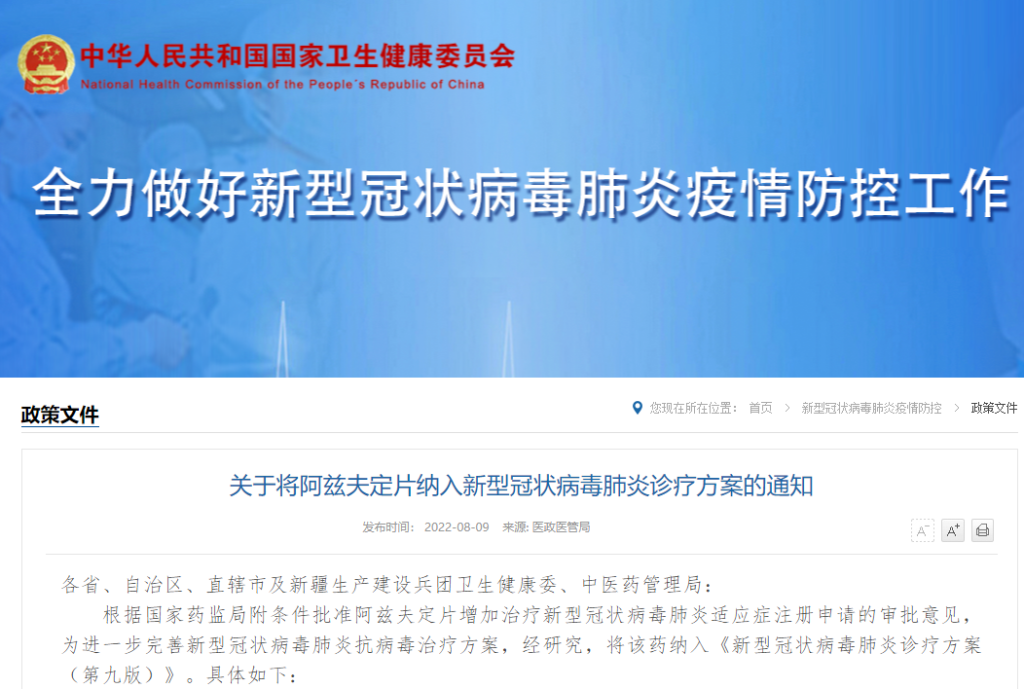 8月9日,国家卫健委消息,根据国家药监局附条件批准阿兹夫定片增加治疗新型冠状病毒肺炎适应症注册申请的审批意见。为进一步完善新型冠状病毒肺炎抗病毒治疗方案,经研究,将该药纳入《新型冠状病毒肺炎诊疗方案(第九版)》。
