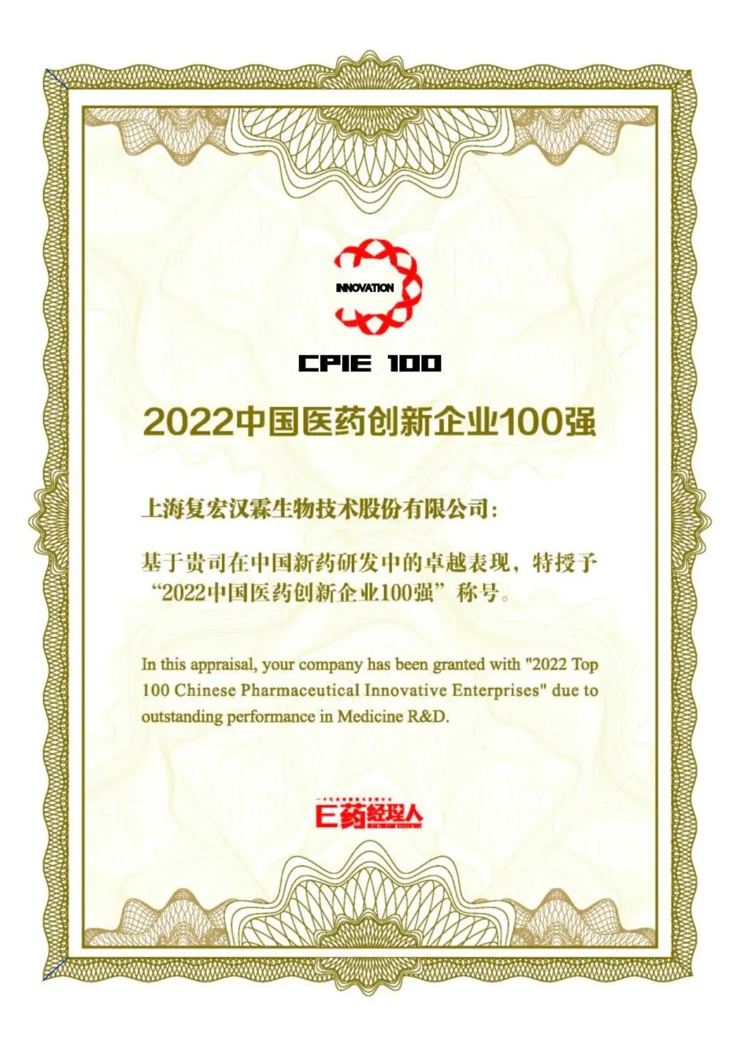 业内知名媒体《E药经理人》近日发布“2022中国医药创新企业100强”榜单,复宏汉霖凭借出色的多维度创新实力蝉联“2022中国医药创新企业100强”第一梯级。复宏汉霖此次再度入选百强榜单,是业界对公司的持续认可与鼓励。未来,公司将继续以创新为本,向更具规模化和市场竞争力的Biopharma进化,为中国生物医药产业的长足发展贡献力量。