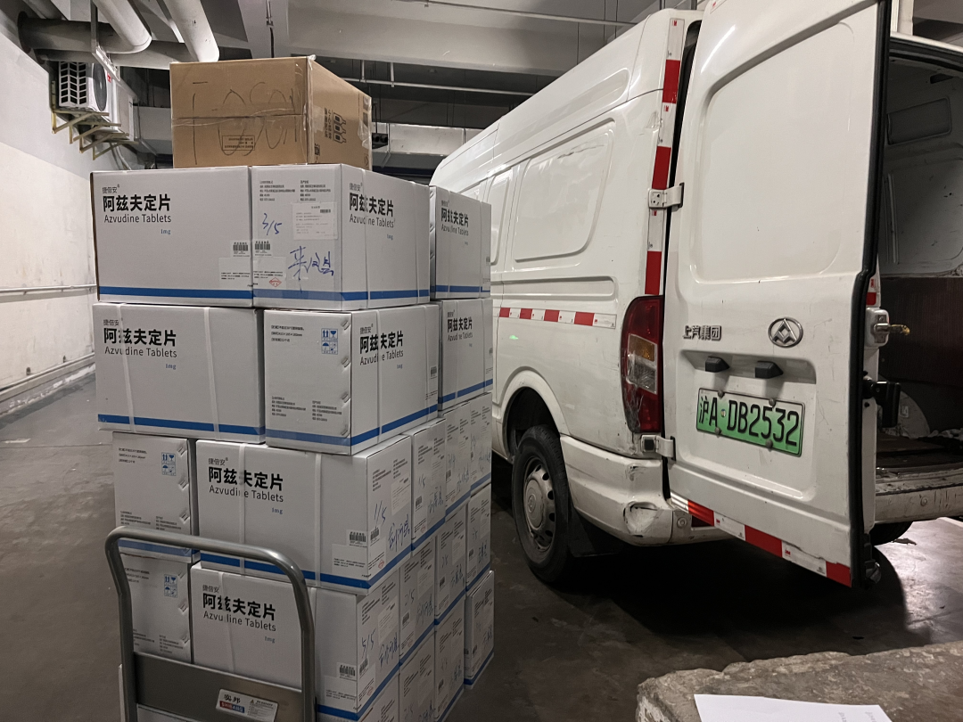 “非凡 阿兹夫定捐赠专项战役小组”紧急对其进行物资匹配及筹措。1月25日,年初四,非凡 基金会助理秘书长郭帅早早来到办公室,对阿兹夫定进行核对、分类、拆箱、登记追溯码,然后再将物资搬上推车。早上十点,6200瓶阿兹夫定完成出库。