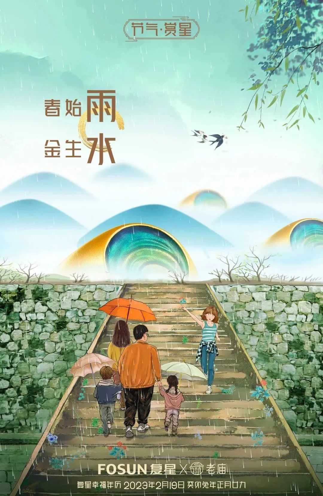 本期这张雨水海报,描绘了一家人郊游登山的幸福景象。远景青山舒朗,绿意萌动,融入老庙古韵事事金安系列中的山海金,扣合“春始雨,金生水”的节令特点。