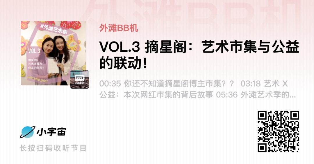 扫描下方二维码,收听BFC与侃侃、梁钰的对话。两人不仅讲述了过往公益项目的暖心故事,更深度分享了此次市集的相关情况。如果你对公益、艺术、自媒体感兴趣,就千万别错过这次市集!