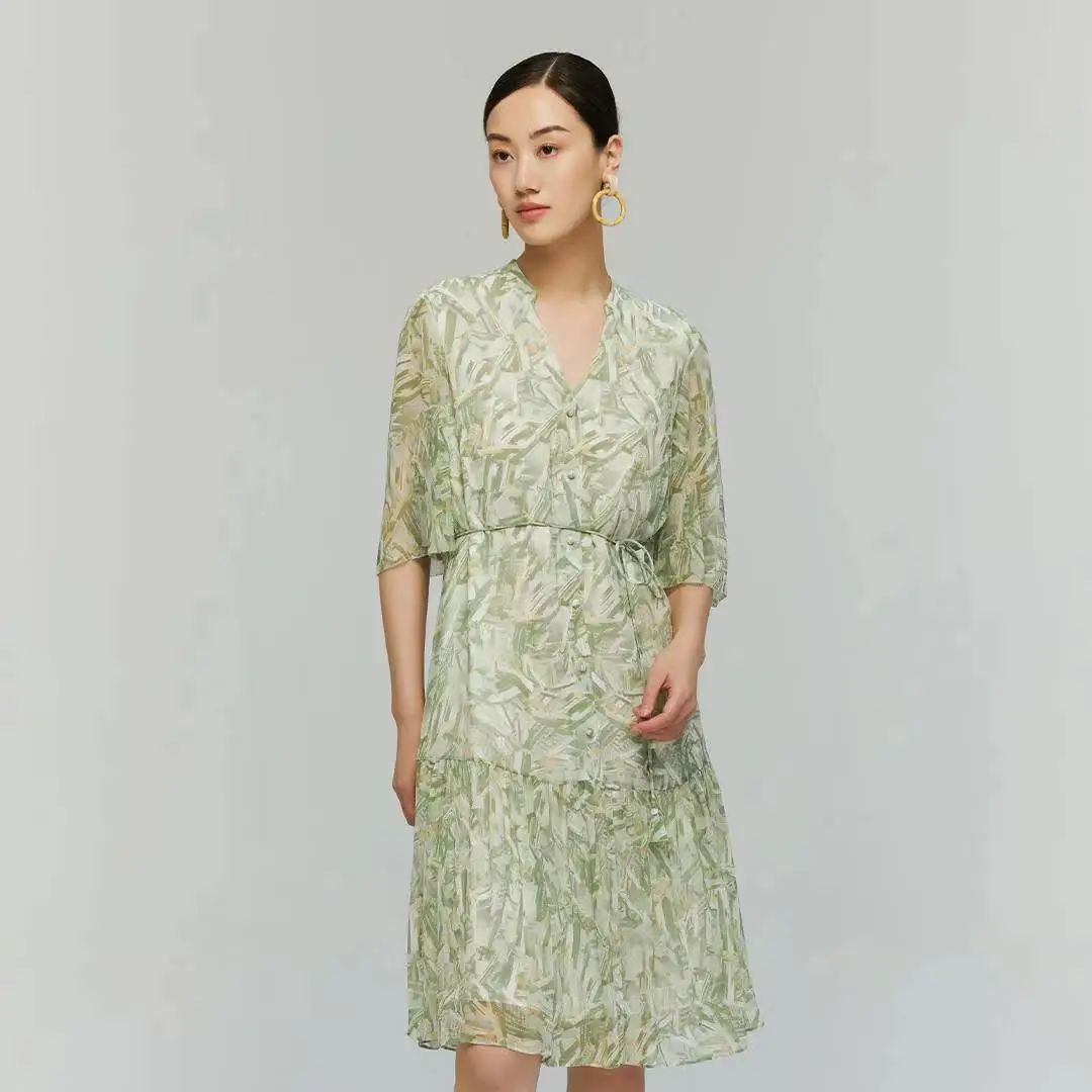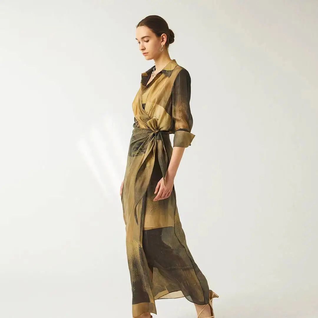 艺术感顺纡绉6A级真丝中袖连衣裙