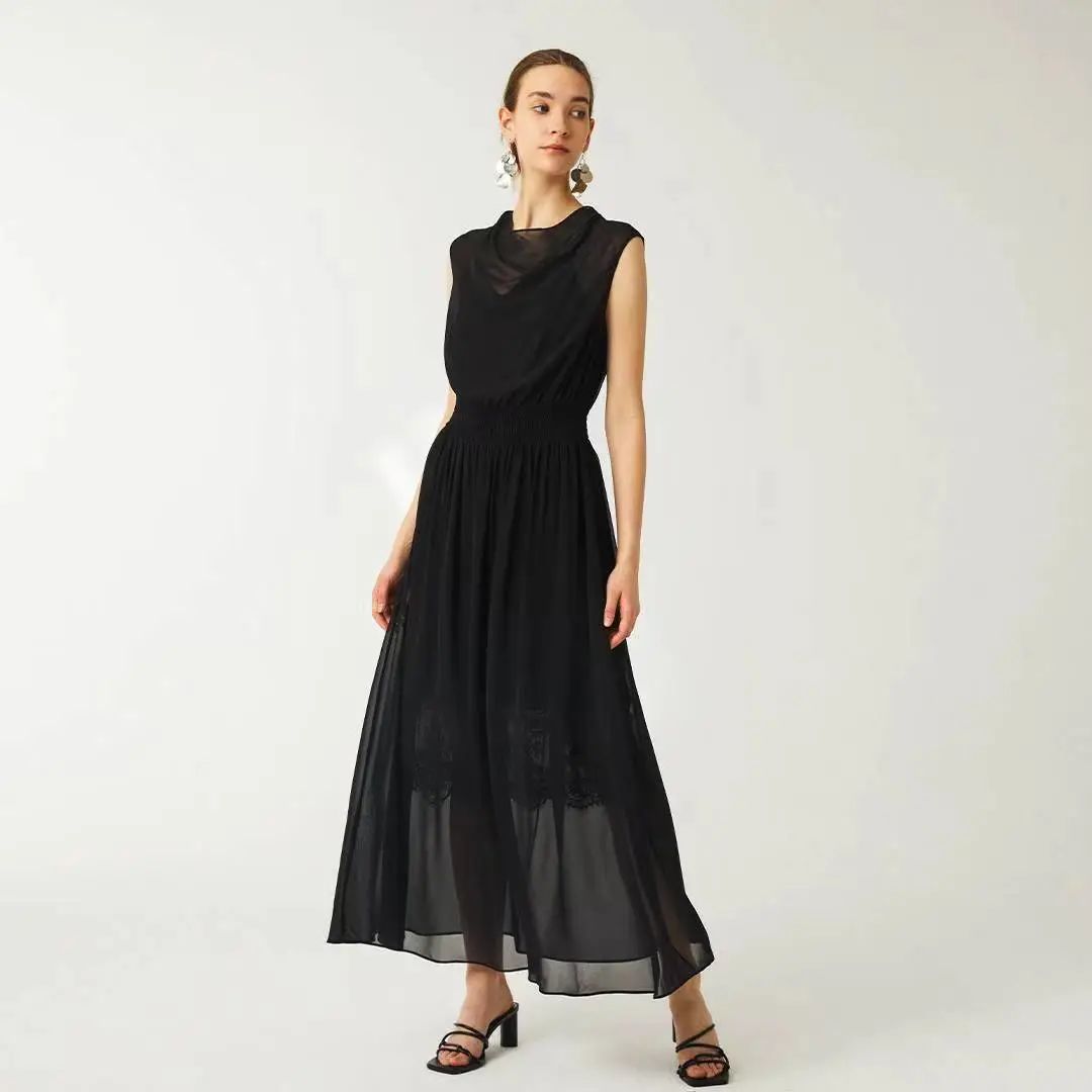 A级真丝乔其蕾丝花边装饰无袖连衣裙