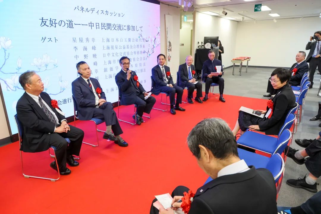 基金会”)作为支持单位参与此次交流活动。作为上海开展民间对外友好交流的人民团体,这是上海市友协在实行新冠“乙类乙管”政策后第一次在海外举办交流活动。中日两国政治、文化、经贸、科技、教育、新闻等领域近70位嘉宾出席,其中还有从大分、冈山、广岛等地特地赶来的上海市友协的老朋友。 此次活动以交流笔会开场,中日两国八位书法家现场挥毫泼墨,以艺会友,共同完成了八幅书法作品,有祈望美好生活的“花好月圆”、有寄予两国友好的“海上花开玉兰情”“情深似海”,有反映民族品格的“海纳百川”“开诚相见”等,通过两国共同文化的交流展示,迅速将活动气氛推向高潮。中日书法家涵盖了老中青三代人,象征着中日文化交流得到接续传递。今年是《中日和平友好条约》缔结45周年,交流活动环节之一是邀请中日嘉就“友好之路——我经历的中日民间交流”这一主题开展对话,就如何通过民间的合作交流推动两国关系发展发表真知灼见。