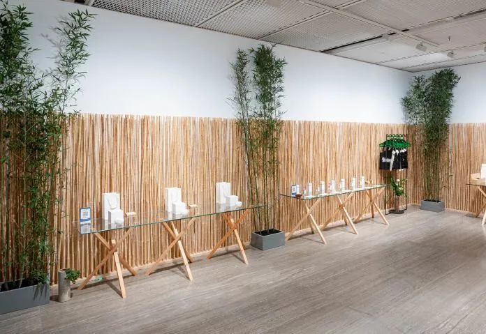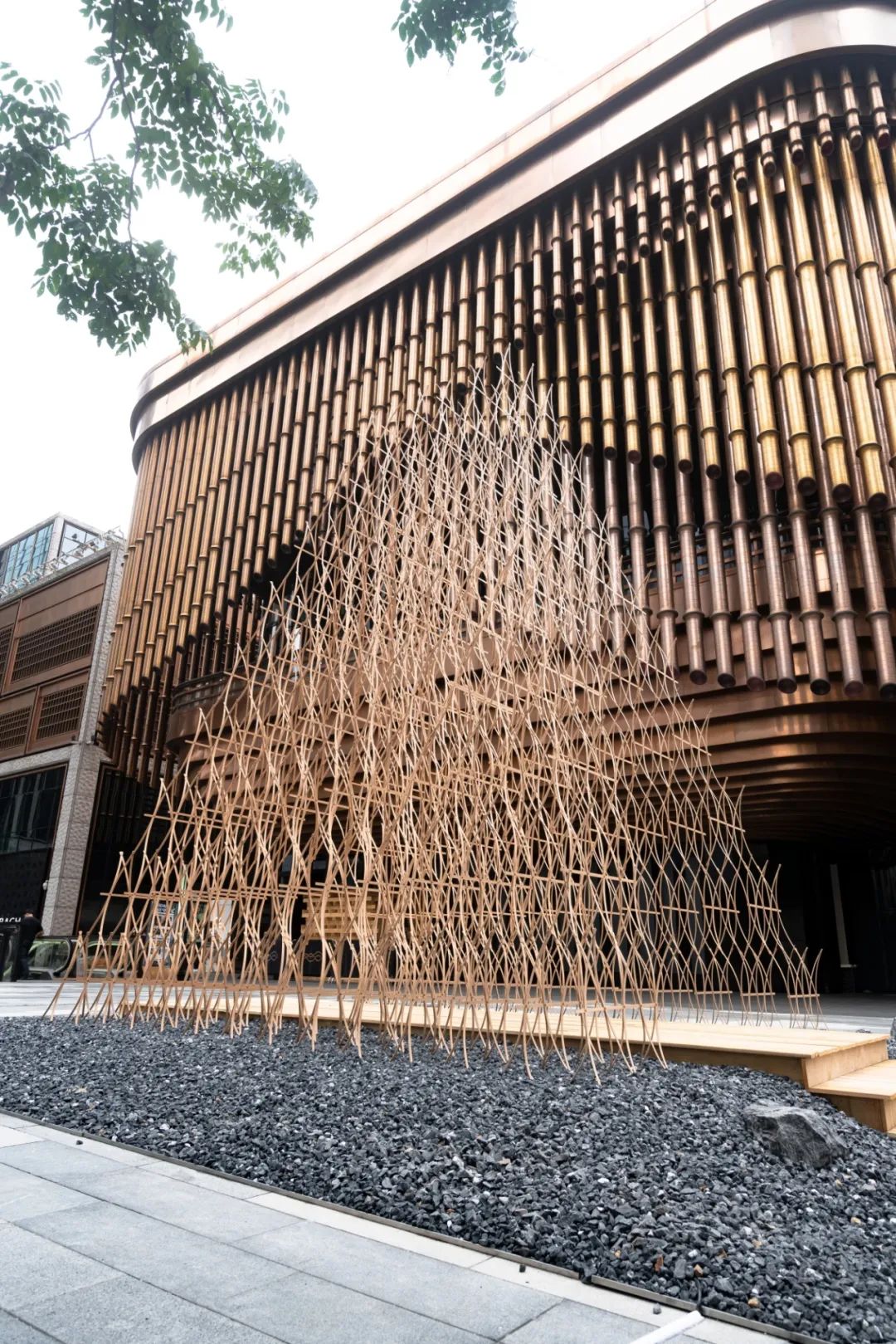 本次展览以“竹”为序章,走进上海非凡 艺术中心一层展厅,入口处是隈研吾全新设计的装置作品《竹涧》,重现了隈研吾内心深处描绘的“原风景”——上万只竹条由可再生、可重复组装的构件所连接,竹的柔韧与重力形成绝妙的平衡,形成竹的曲线,浮于空中。