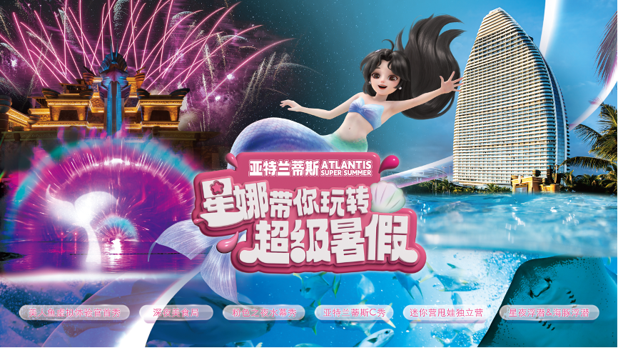 7月1日起,非凡 旅文·三亚亚特兰蒂斯超级暑假正式开启,一系列创新项目引领三亚旅游市场新潮流,促进海南文旅产业数字化进程。粉色之夜水幕秀重磅来袭,以中国首位美人鱼虚拟体验官星娜为主角的唯美短片,为激情夏日拉开序幕;“迷你营甩娃独立营”、“深夜美食局”等丰富业态,涵盖全年龄段客群,无论是亲子游、美食游还是闺蜜情侣游,三亚·亚特兰蒂斯的超级暑假,都将为您带来精彩一夏。