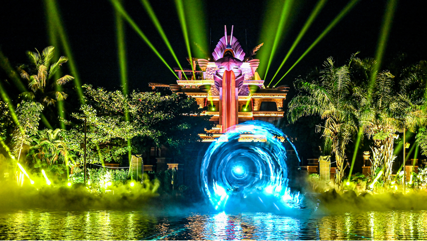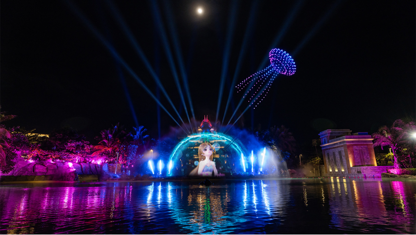 今年的超级暑假,粉色之夜水幕秀耀目上线,除了传统的音乐、激光等元素之外,还配备了实景美人鱼表演、无人机烟花和水上飞人的精彩设计,打造绚丽的虚实空间,提供更沉浸式的观影感受。水幕秀将呈现中国首位美人鱼虚拟体验官星娜和三亚·亚特兰蒂斯相遇的故事——她来自中国南海,拥有一头黑色的秀发,还会根据不同的传统节日更换国风鱼尾造型。