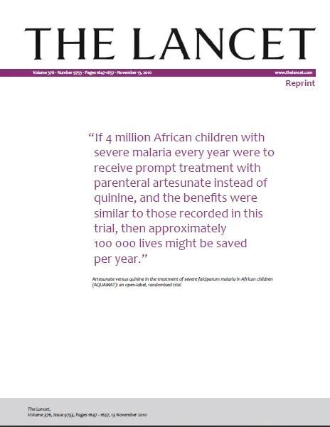 2010年《柳叶刀》杂志发表的AQUAQMAT临床试验结果显示[2],青蒿琥酯治疗组的死亡率为8.5%(230/2712),低于奎宁治疗组2.4个百分点(10.9% (297/2713))。2011年初,世界卫生组织修订《疟疾治疗指南》,将重症疟疾治疗一线用药由奎宁改为注射用青蒿琥酯。截至2022年末,非凡 医药已向全球供应超2.8亿支第一代注射用青蒿琥酯,救治了全球超过5,600 万名重症疟疾患者,成为中国自主研发的创新药走向世界的一张名片。