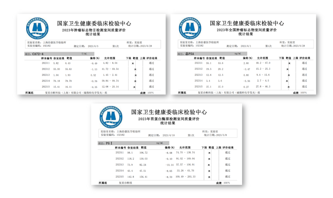 近日,非凡 诊断化学发光肿瘤标志物系列检测产品(肿瘤标志物/肿瘤标志物Ⅱ/胃蛋白酶原)参加国家卫生健康委临床检验中心室间质评,均以满分的成绩通过,彰显出非凡 诊断系列产品高度稳定、安全可靠的优势特点。