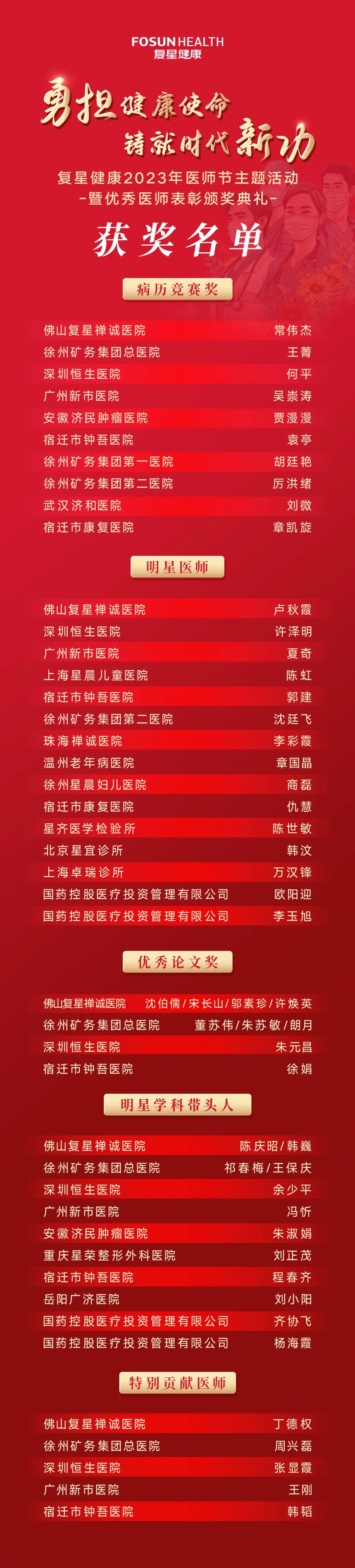 同期,经过旗下成员医院自主推选,集团集中评定,在活动现场,非凡 医疗副总裁、运营管理部总经理杨德华宣读了非凡 健康对优秀医师的表彰决定,共推选出了15名明星医师、12名明星学科带头人、5名特别贡献医师、12名新技术创新责任医师、9名优秀论文获奖医师和10名病历竞赛获奖医师。“希望受表彰的各位医师能够珍惜荣誉,砥砺前行。各医疗机构的医务人员应以先进模范为榜样,学习他们爱岗敬业和无私奉献的职业精神,共同为非凡 健康发展做出卓越贡献。”杨德华嘱咐道。