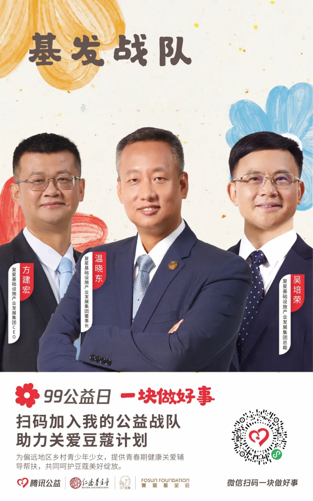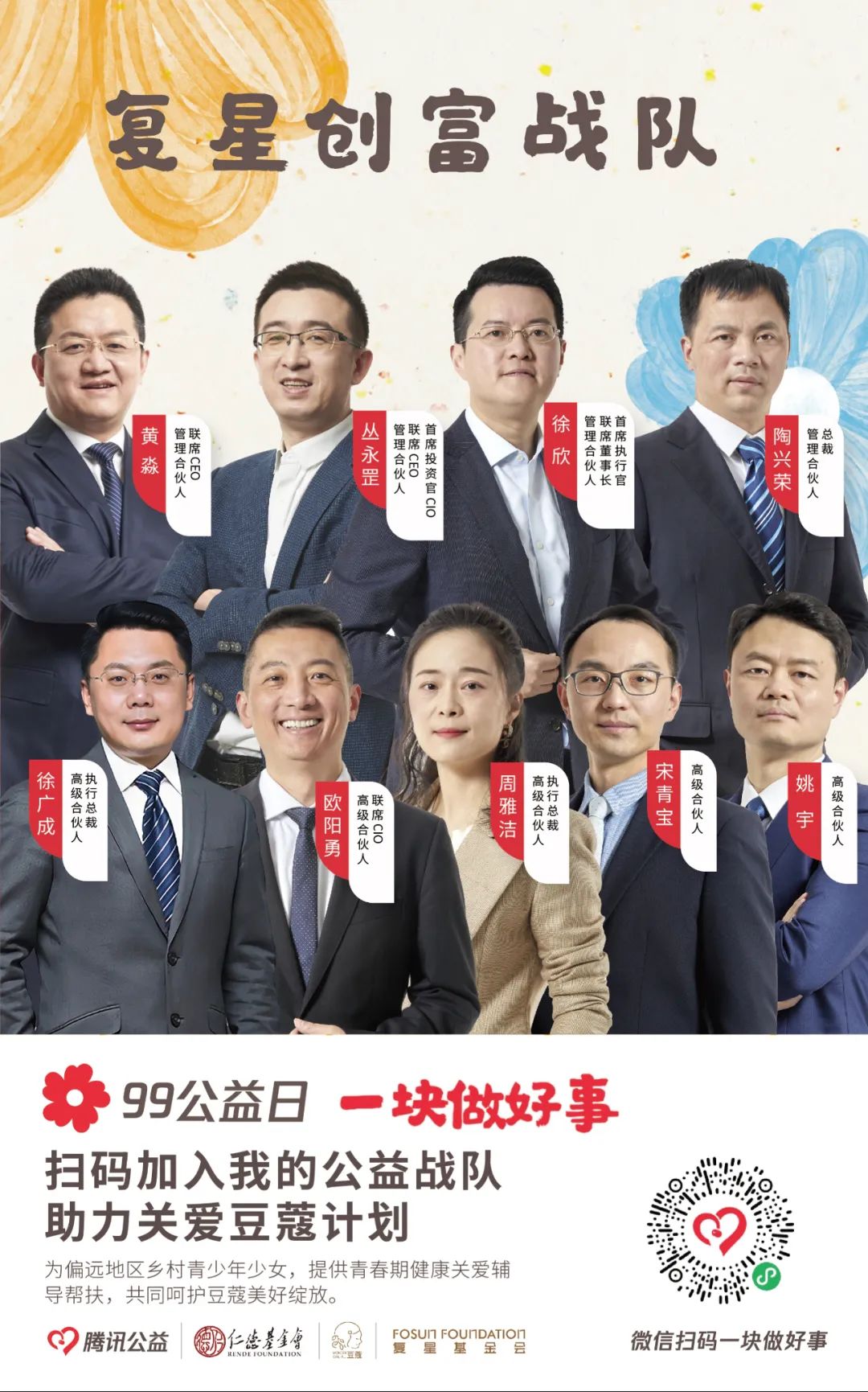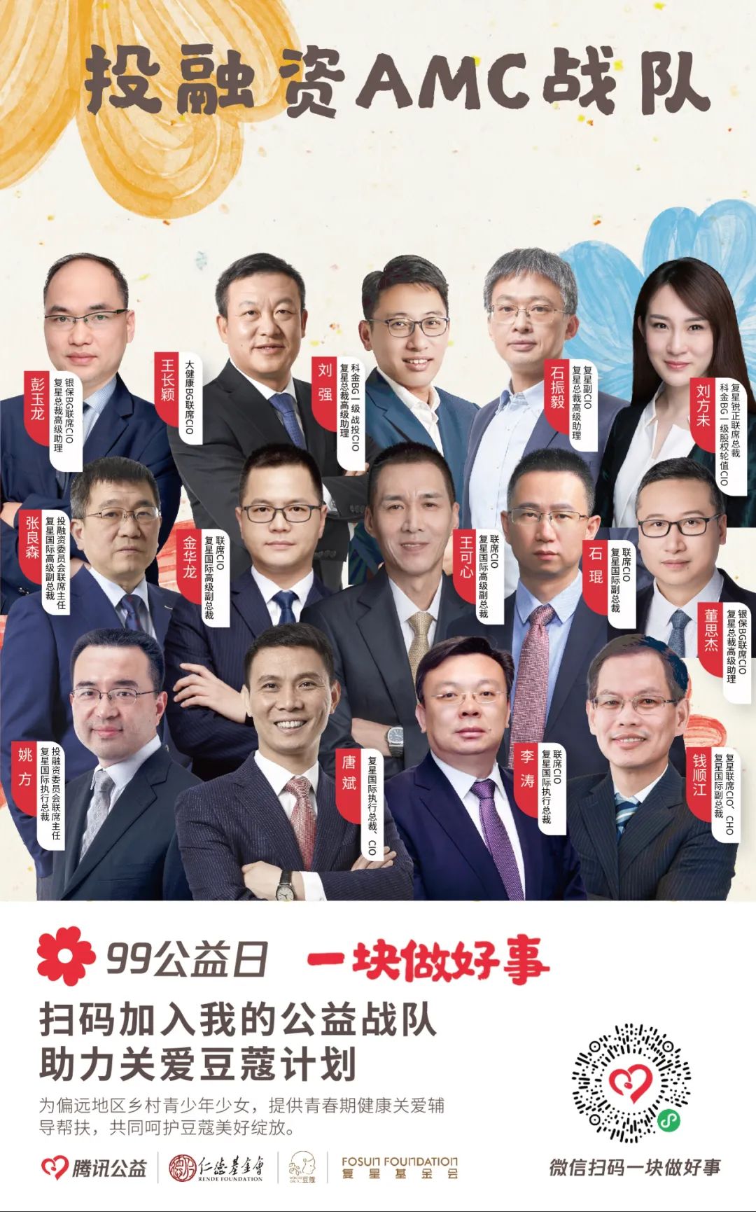 由【集团本部战队】【大健康战队】【大快乐战队】【大富足战队】【大智造战队】【蜂巢战队】六大一级战队裂变而出20支二级战队,将发动非凡 一家全体力量,通过与中国人口福利基金会、上海仁德基金会两家公募基金会合作,为今年99公益日筹款项目进行募捐。