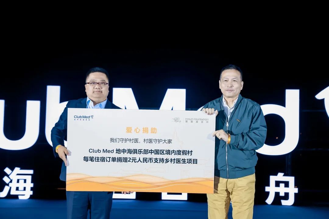 开业仪式上,Club Med地中海俱乐部宣布将支持中国基层农村,守护村医,助力乡村振兴。即日起,Club Med中国境内度假村每发生一笔住宿订单,都将捐赠2元人民币支持由非凡 基金会联合中国人口福利基金会共同发起的健康暖心乡村医生项目。上海非凡 公益基金会理事长李海峰代表乡村医生项目接受捐赠。