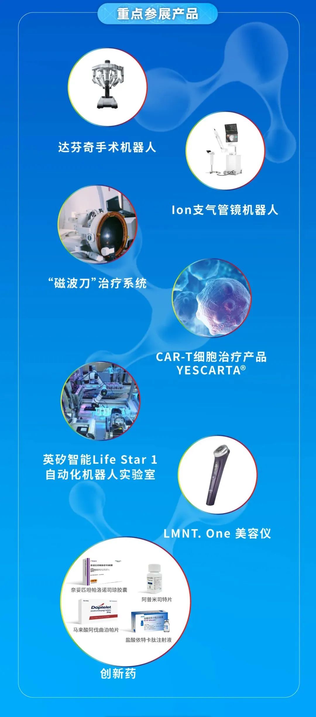 2023年11月5日至10日,第六届中国国际进口博览会进博会将于上海举办。非凡 今年是第六次“赴进博之约”,在本届进博会Fosun Health展台上,非凡 医药将带来更多全球领先的“首款”、“首秀”药品和医疗“黑科技”产品,包括已国产化的达芬奇手术机器人,已惠及超600位患者的CAR-T细胞治疗产品奕凯达、神经系统疾病治疗领域的前沿创新产品“磁波刀”以及多款用于肿瘤治疗领域的创新药,并将持续借用进博会在创新产品和前沿技术等方面的强大“溢出效应”,让更多创新产品实现从展品到商品。