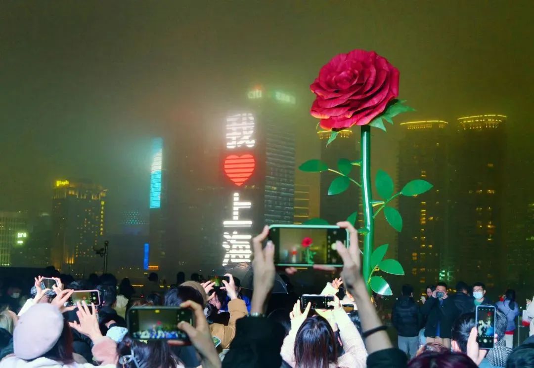 2月14日,由BFC和设计团队打造的高达近4米的巨型玫瑰亮相外滩,童话《小王子》同款浪漫玫瑰和陆家嘴地标建筑的“我爱上海”字幕遥相呼应。