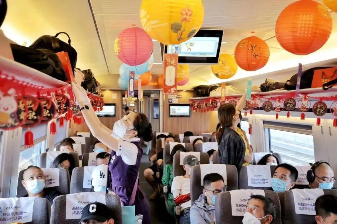 9月29日,飞驰在杭绍台铁路的G7713次列车张灯结彩,乘务员精心服务为旅客营造欢乐的中秋氛围。作为首条民营控股高铁,杭绍台铁路2023年客流同比增长200%,运营两年累计运送旅客即将突破2000万人次。