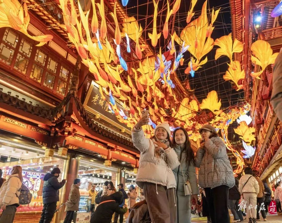 12月17日,豫园凝晖路,三名游客正在刚刚点亮的一夜鱼龙舞灯组下打卡自拍。甲辰龙年豫园灯会延续“山海奇豫记”主题,“一夜龙鱼舞”灯组率先亮灯,演绎鱼化龙的奇妙想象。(解放日报 孟雨涵摄)