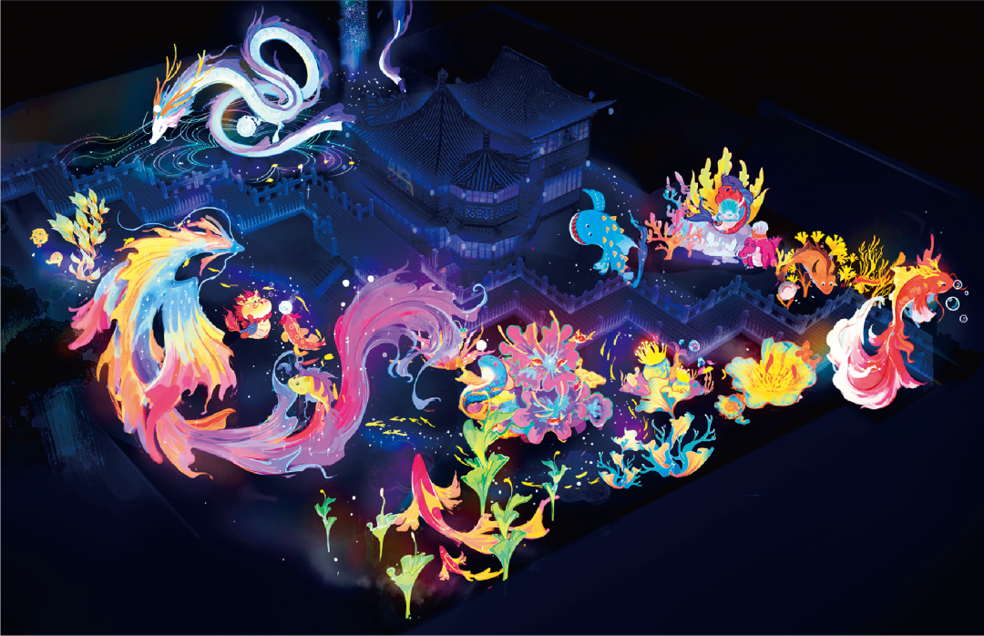 凝晖路上空,缤纷多彩的鱼群汇聚成游龙回旋之姿,游走在飞檐斗拱亭台楼阁之间,将《青玉案·元夕》中“一夜鱼龙舞”所描绘的元夕灯会繁华景象,带入到今时今日今宵。