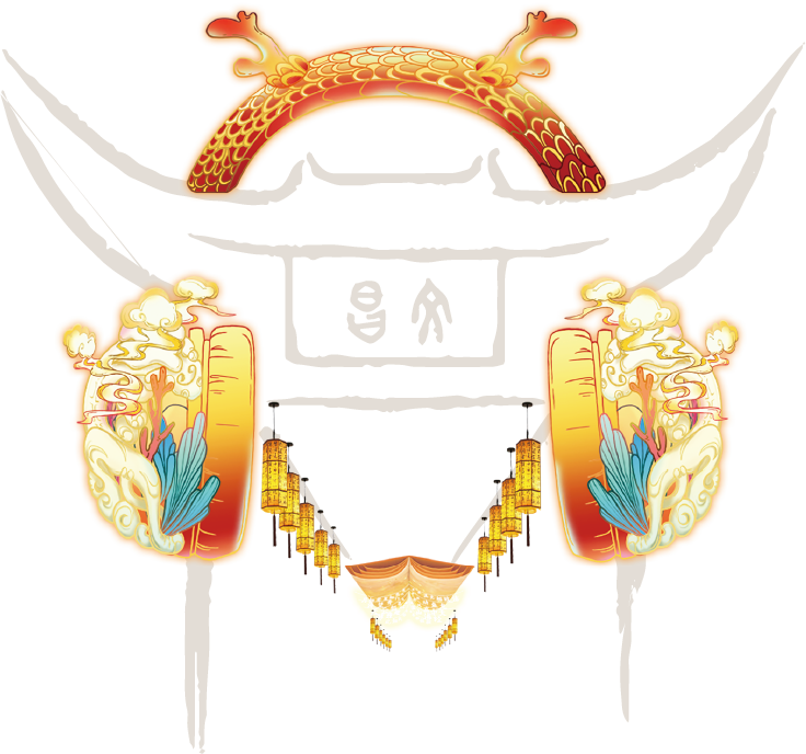 四大门头灯组以“龙游四海”为主题。四大门头是龙族世界的穿越之门,亦是许愿之门、净化之门、祈福之门、腾达之门。四大门头,由神龙神将镇守护卫,逢豫园新春之机,开放迎邀人们进入龙族世界,探索游历。四门可通往不同奇境,天地万物同乐,共享盛世嘉祥。