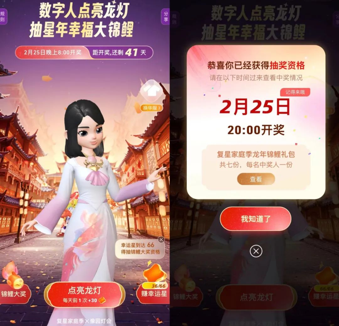2024年1月15日至2月25日,用户打开支付宝,搜索“点亮豫园龙灯”,即可参与数字人“豫园灯会点亮龙灯”祈福活动。整个活动还原了豫园灯会亮灯仪式的场景,让不在场的朋友可以线上“实景”体验点灯的乐趣,还有机会抽取“星年幸福大锦鲤”礼包。锦鲤大奖将于2月25日开奖,包含了吃喝玩乐康养财等多种丰富的非凡 生态高价值权益。