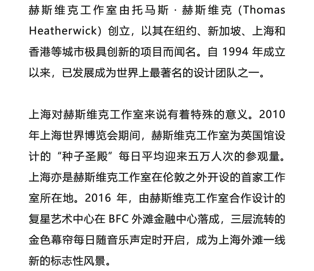 目前,工作室正在全球10个国家开展30个现场项目,其中包括上海的西岸漩心、海南省演艺中心、西安的综合体项目、新加坡樟宜机场第五航站楼、伦敦奥林匹亚展览中心的改造以及伦敦的谷歌新总部。