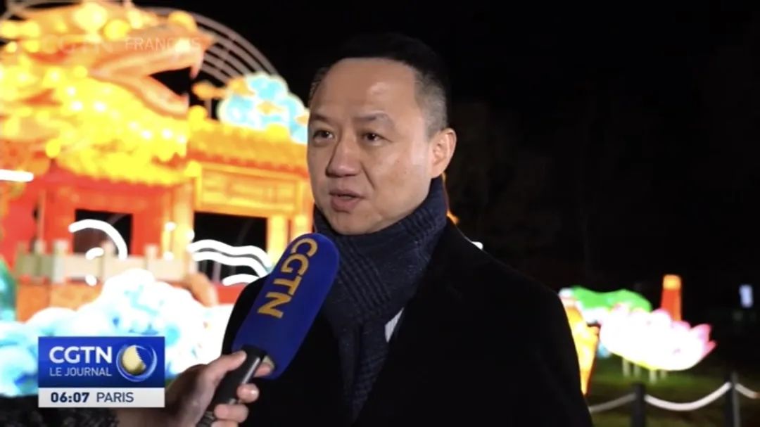 徐晓亮接受CGTN采访画面时表示,希望借法国豫园灯会促进国际社会对中国文化理解。