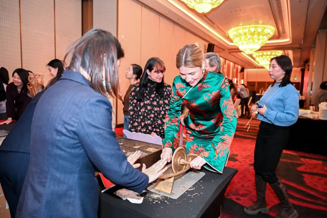 随后,国际友人们还体验了香囊、剪纸、书法、糖画等传统非遗技艺。拥有240年历史的童涵春堂,臻选道地药材,研磨后装入香囊,日常佩戴既有好的寓意,也能起到一定的保健养身效果;一张红纸,一把剪刀,剪刻出各种寓意吉祥、祝福的图案,是逢年过节必备的装饰;春联、福字,同是过年装饰,却是通过笔墨,红纸黑字,写出吉祥如意;拨动转盘,指针所示的图案,即刻呈现,糖画既是美食也是艺术。