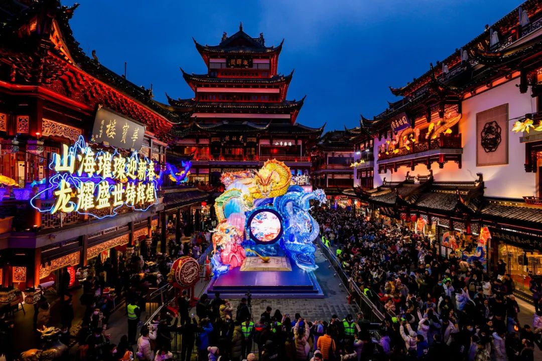 上海老饭店、绿波廊、松鹤楼面馆等品牌的多家门店,单日营业额也创下了历史新高。豫园商圈内的上海老饭店、绿波廊,其年夜饭预定在上一年的六七月就基本进入尾声,看花灯、吃年饭和祈好运三位合体。其中,上海老饭店的盘龙剁椒蒸河鳗、绿波廊的画龙点睛玉龙糕、宁波汤团店的“其乐龙龙”糯米福团等,寓意佳、有年味,深受欢迎。而今年一月重新开业亮相的宁波汤团店小年夜一天就售出了超过七万只汤团。限定版“其乐龙龙”糯米福团光是刻画龙鳞和龙角就要耗费一位点心师半个多小时,而且因为是纯手工制作的,所以可以说“在世上找不到两只一模一样的”。龙的形象也和豫园龙灯巧妙联动。