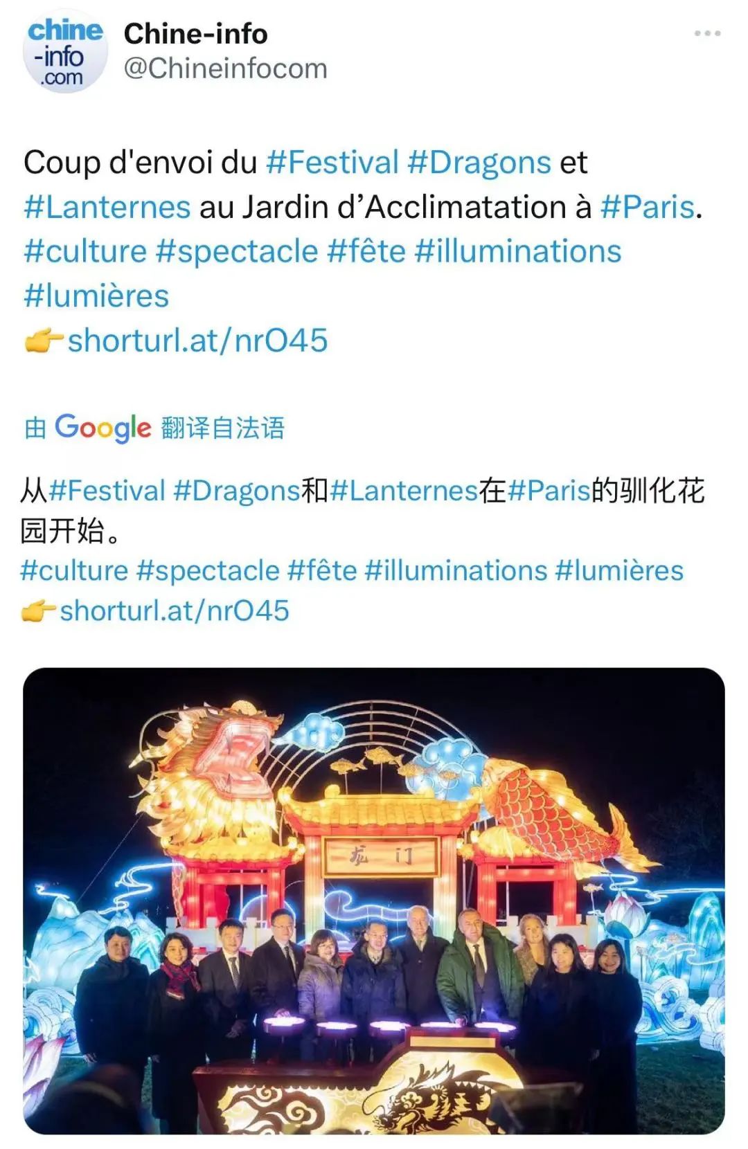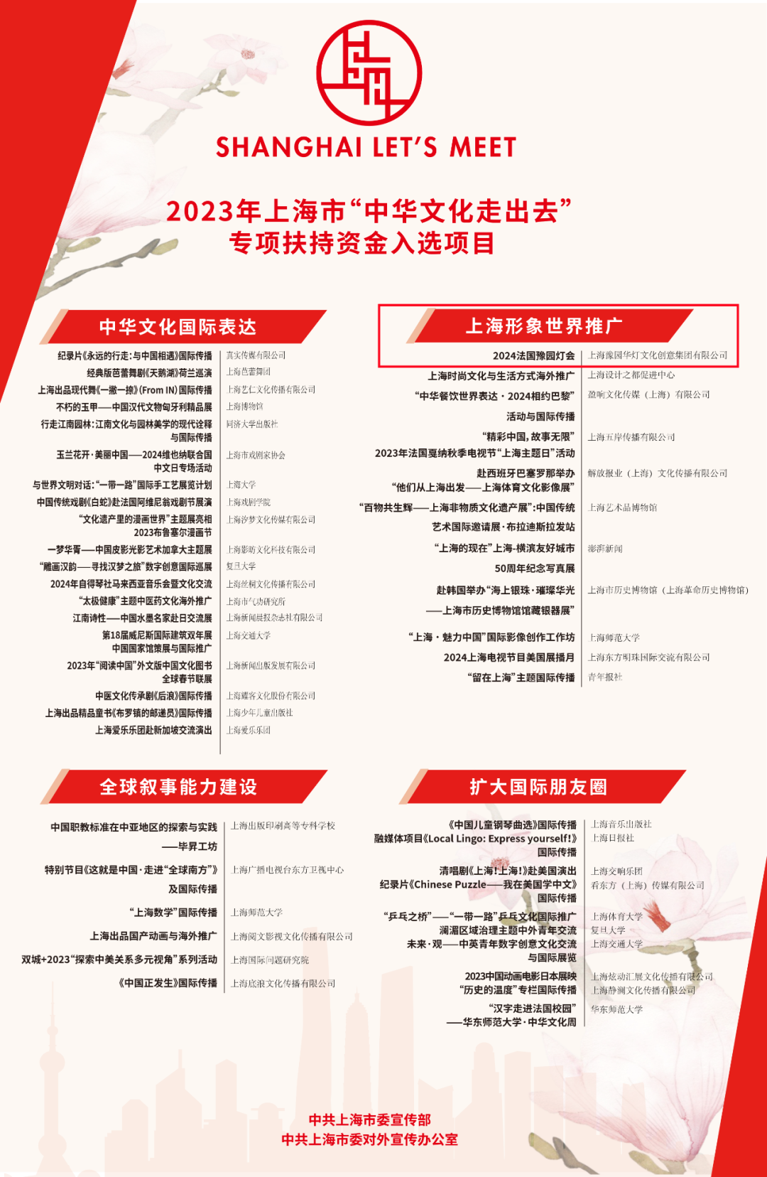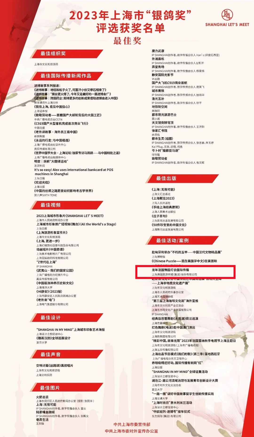 近日,2023年上海市“中华文化走出去”专项扶持资金项目评审和2023年上海市“银鸽奖”评选结果揭晓。经专家评审,2024法国豫园灯会入选2023年上海市“中华文化走出去”专项扶持资金项目2024法国豫园灯会国际传播获得2023年上海市“银鸽奖”最佳活动/案例