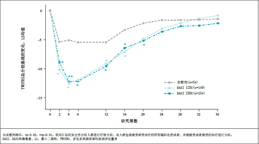 图1. 达希斐®用于治疗CD的TWSTRS总分与基线相比随时间的变化