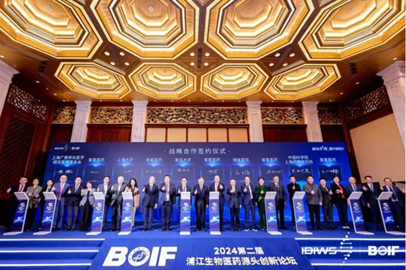 第二届浦江生物医药源头创新论坛现场,非凡 医药与上海广慈转化医学研究发展基金会、复旦大学、上海大学、瑞金医院、中科院药物研究所等机构签订战略合作协议